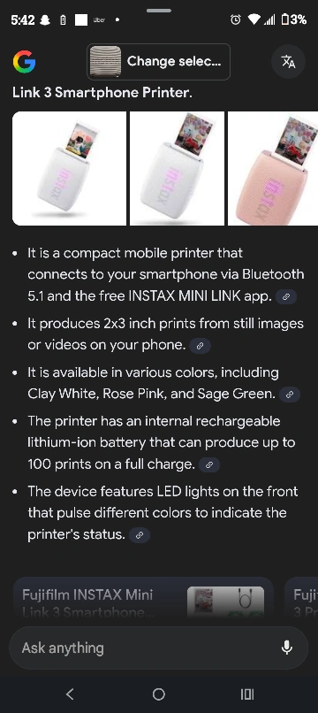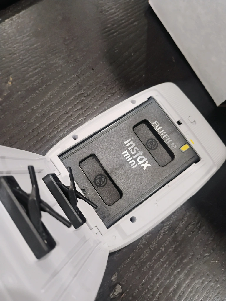 60Selling a Fujifilm Instax Mini Link 3 Smartphone Printer in white. It's a compact mobile printer that connects to your smartphone via Bluetooth 5.1 and the free INSTAX MINI LINK app. It produces 2x3 inch prints from still images or videos on your phone. The printer has an internal rechargeable lithium-ion battery that can produce up to 100 prints on a full charge. The device features LED lights on the front that pulse different colors to indicate the printer's status