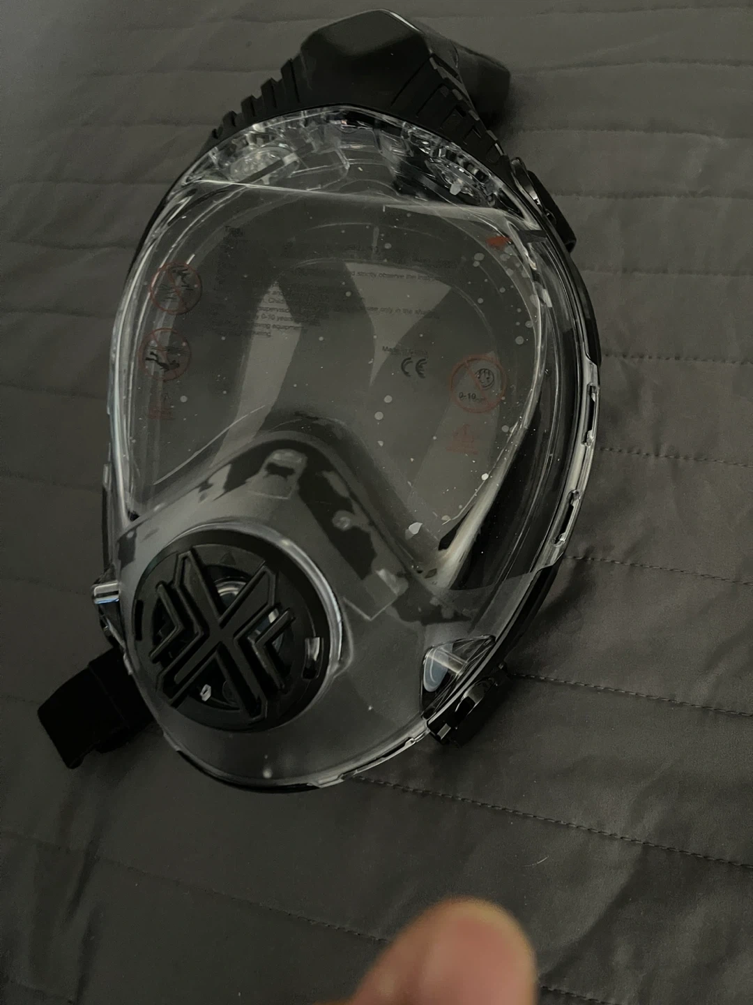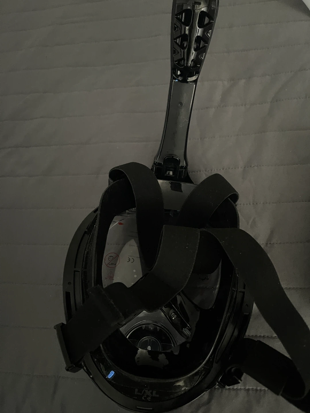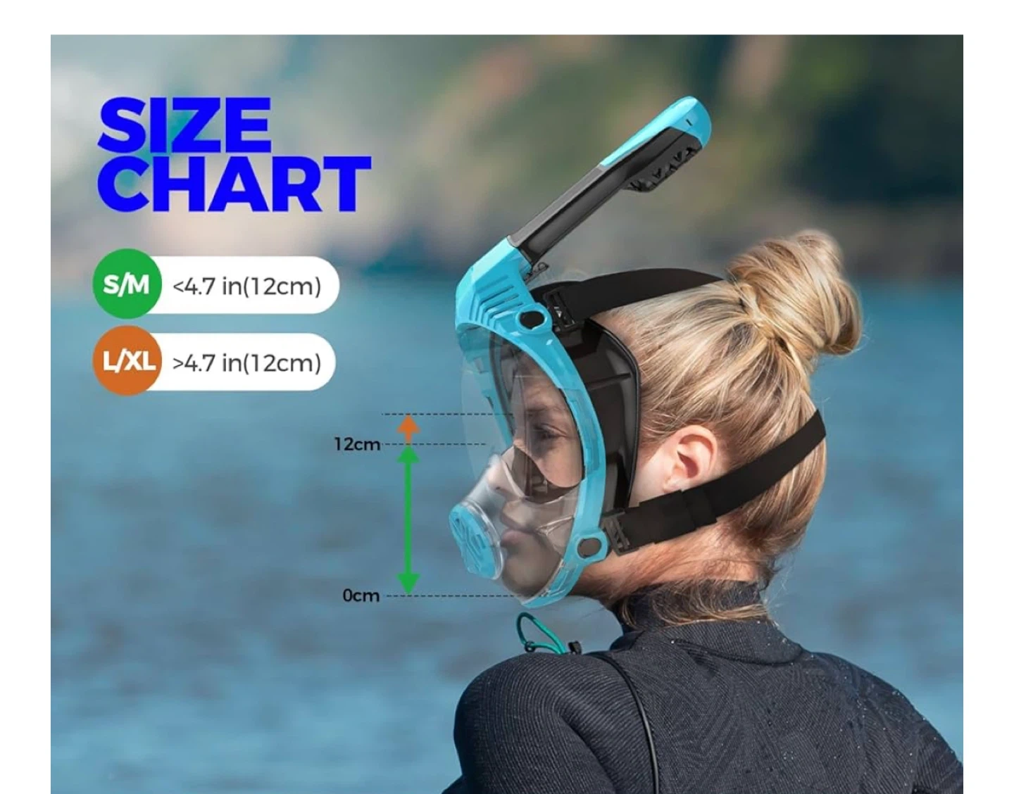 Selling a full face snorkel mask in size L/XL. It has a safe breathing system, CO2 exhaust valve, anti-fog system, and drain valve