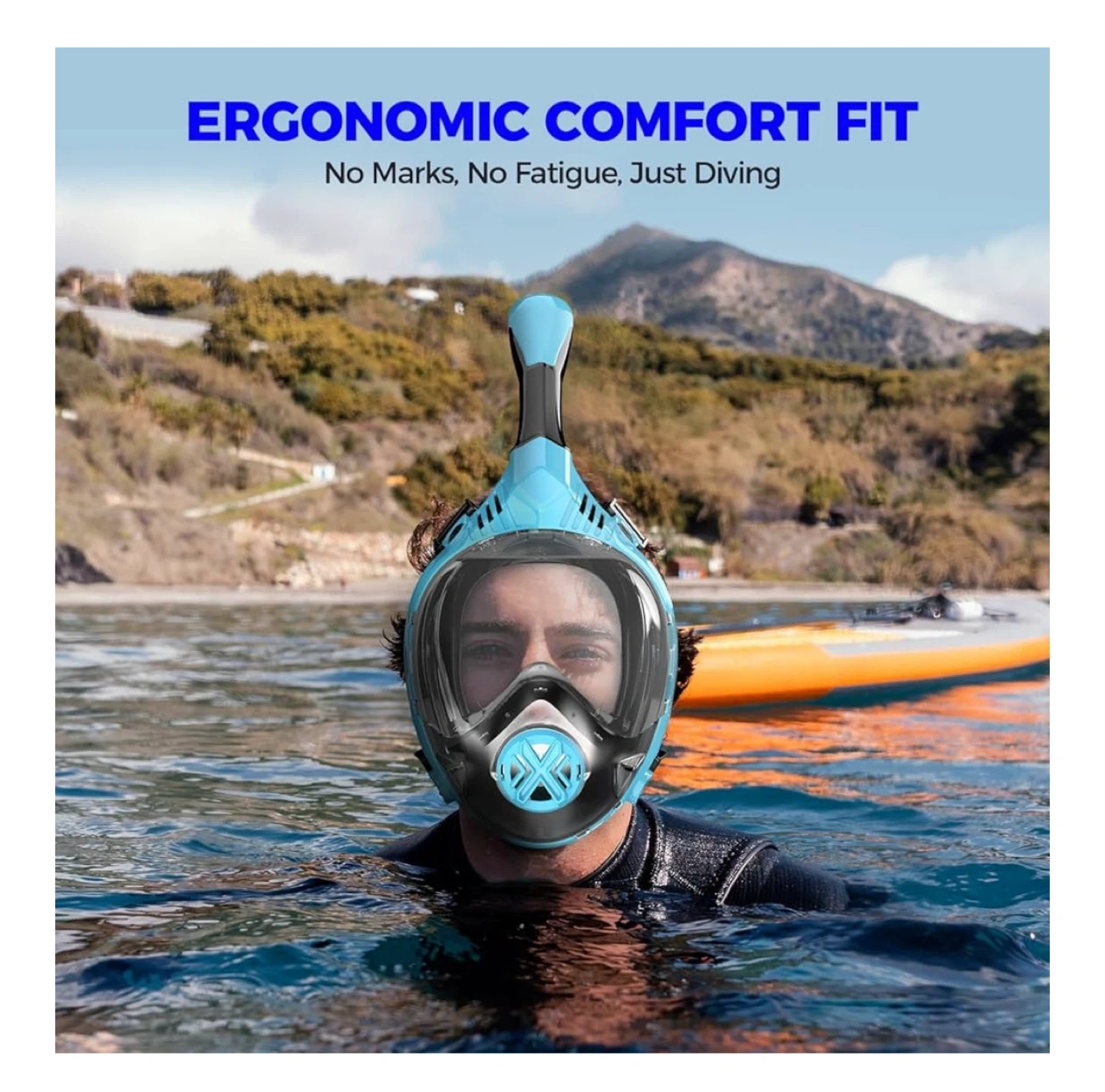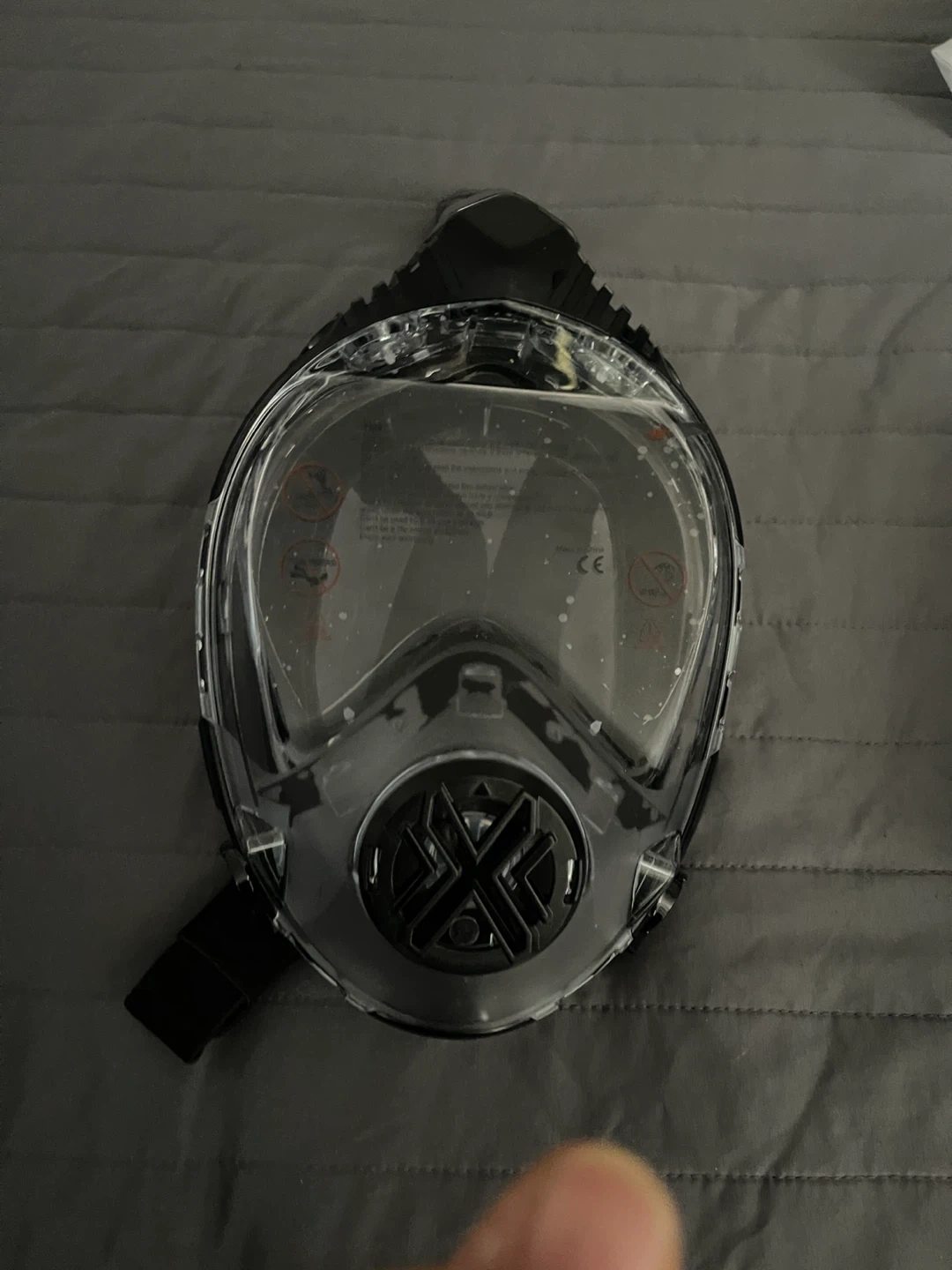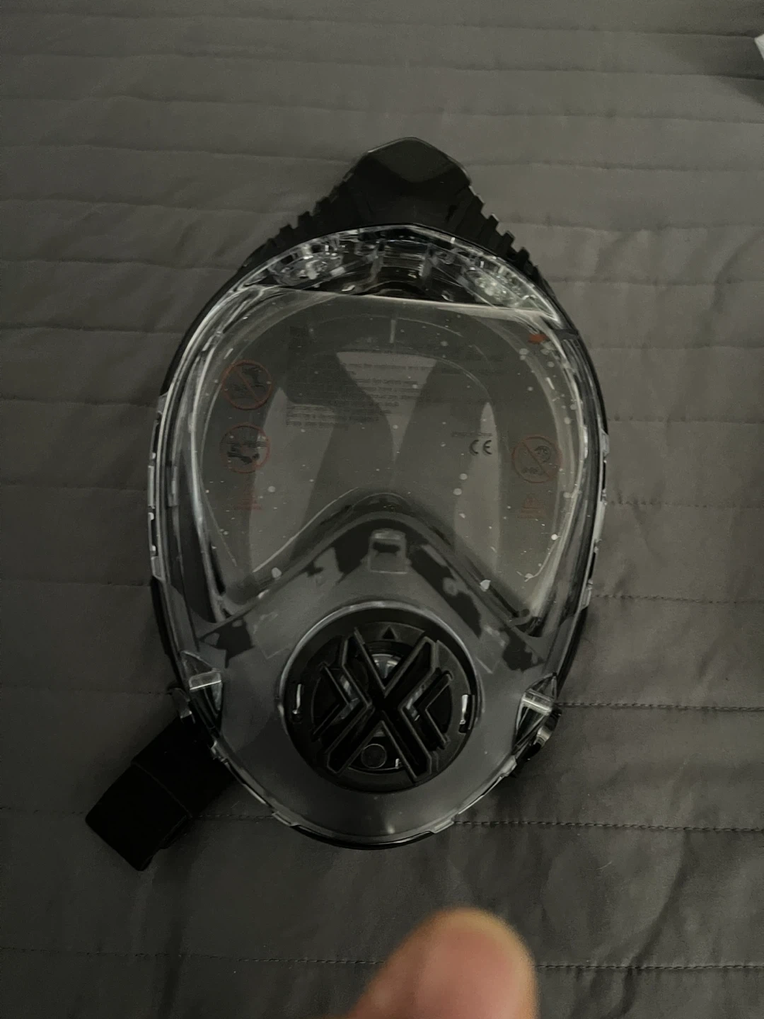 Selling a full face snorkel mask in size L/XL. It has a safe breathing system, CO2 exhaust valve, anti-fog system, and drain valve