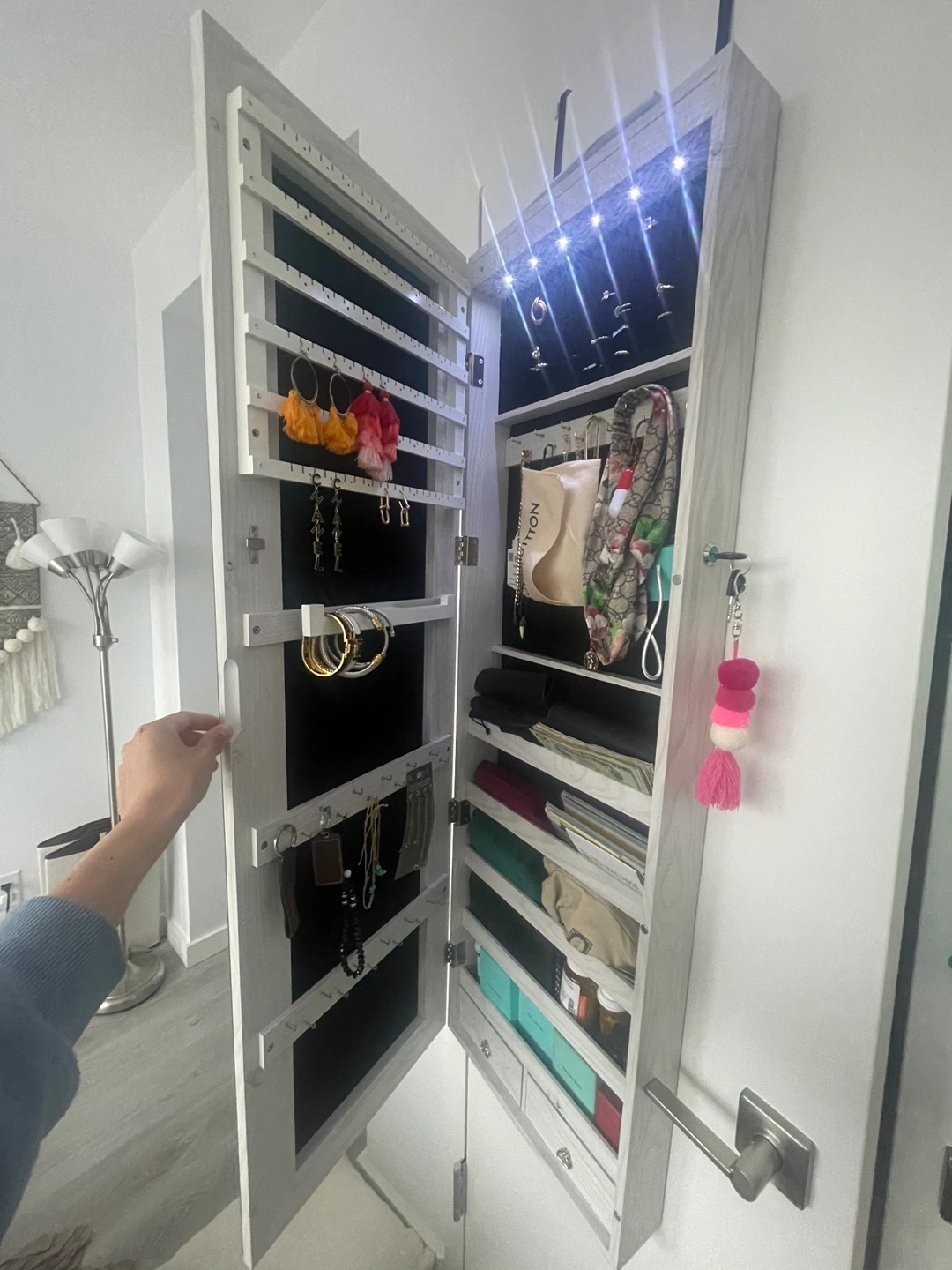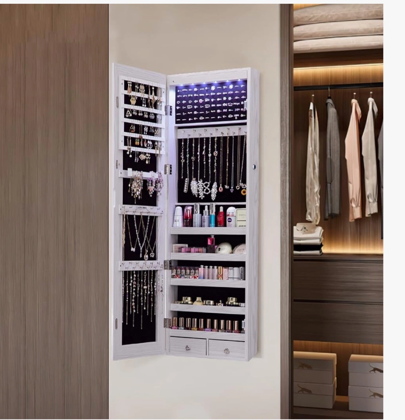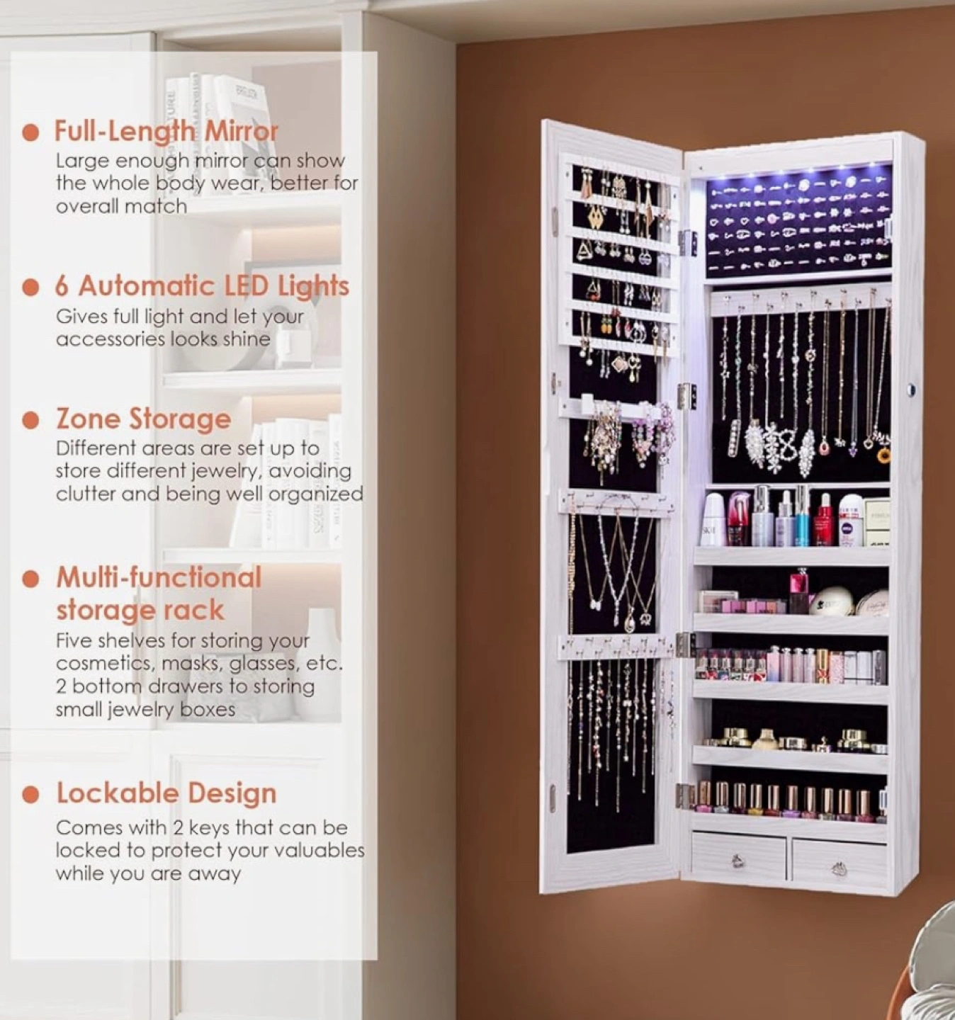 513White wooden armoire, full-length mirror. Features LED lights, multiple storage shelves, drawers, hooks for necklaces and earrings. Lockable with two keys. Perfect for organizing jewelry and cosmetics. Purchased for $400