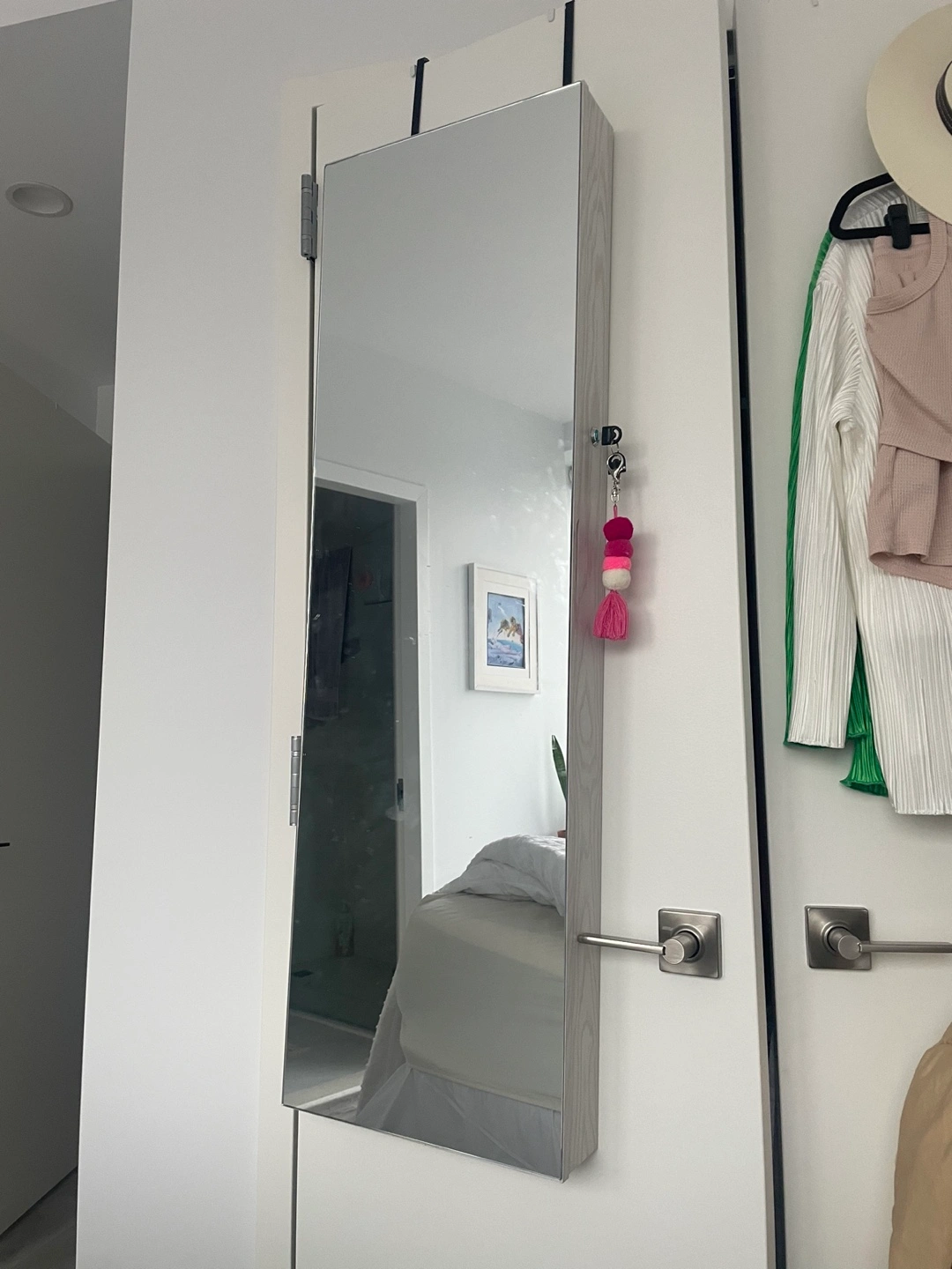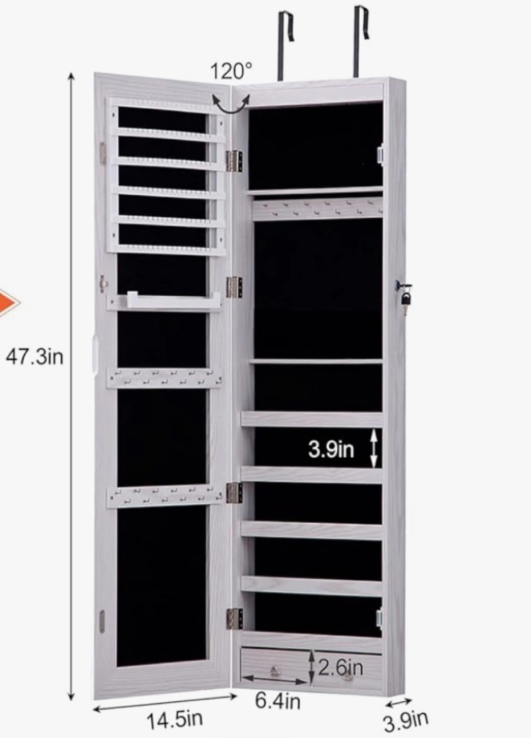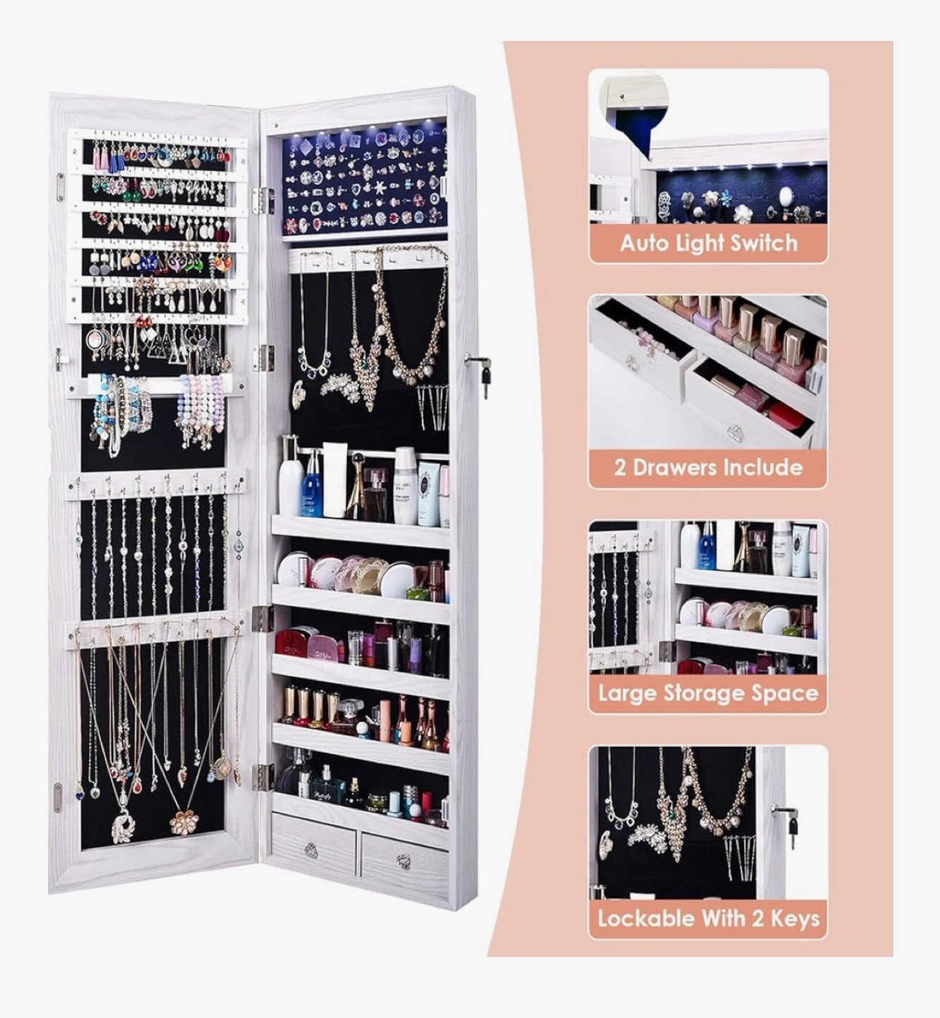 513White wooden armoire, full-length mirror. Features LED lights, multiple storage shelves, drawers, hooks for necklaces and earrings. Lockable with two keys. Perfect for organizing jewelry and cosmetics. Purchased for $400