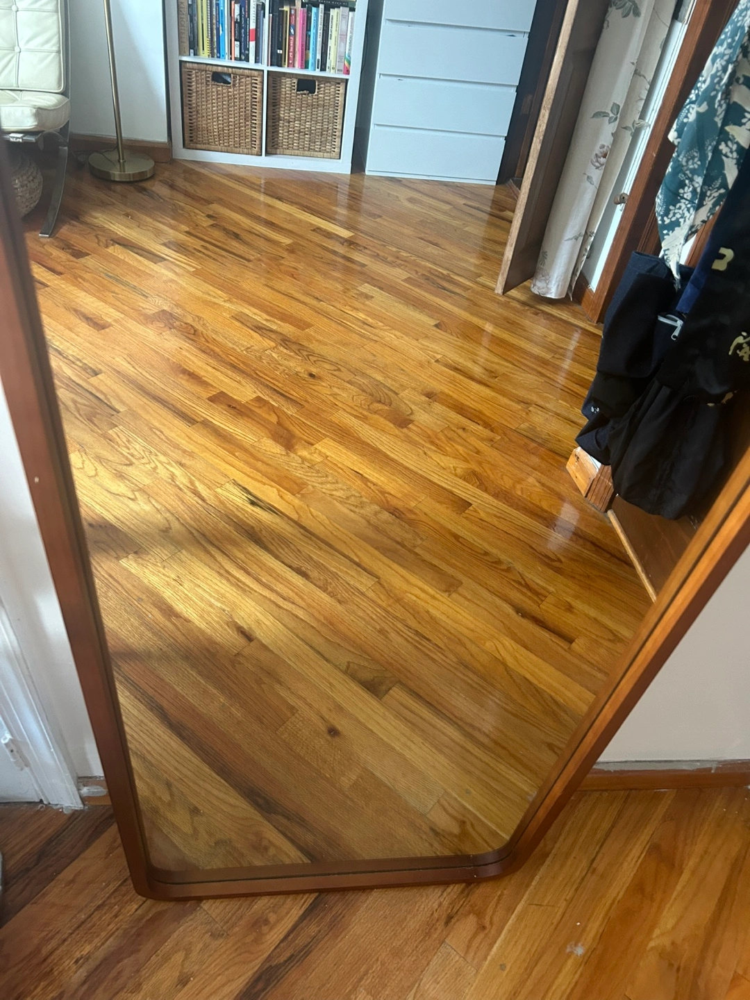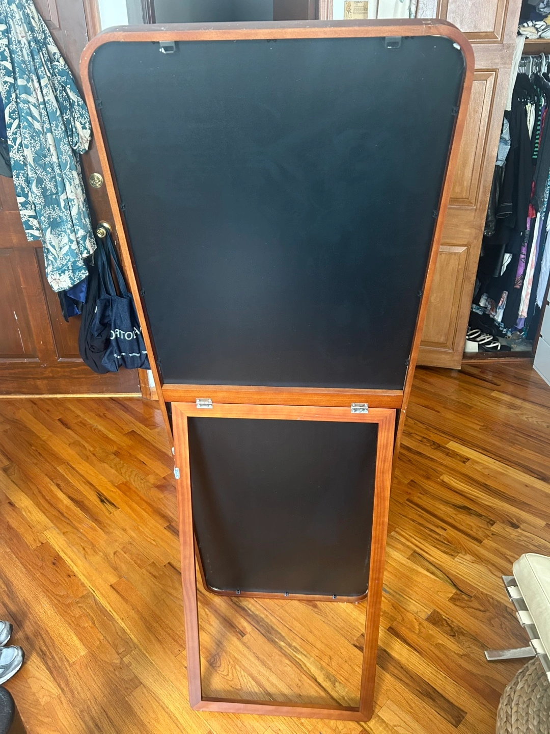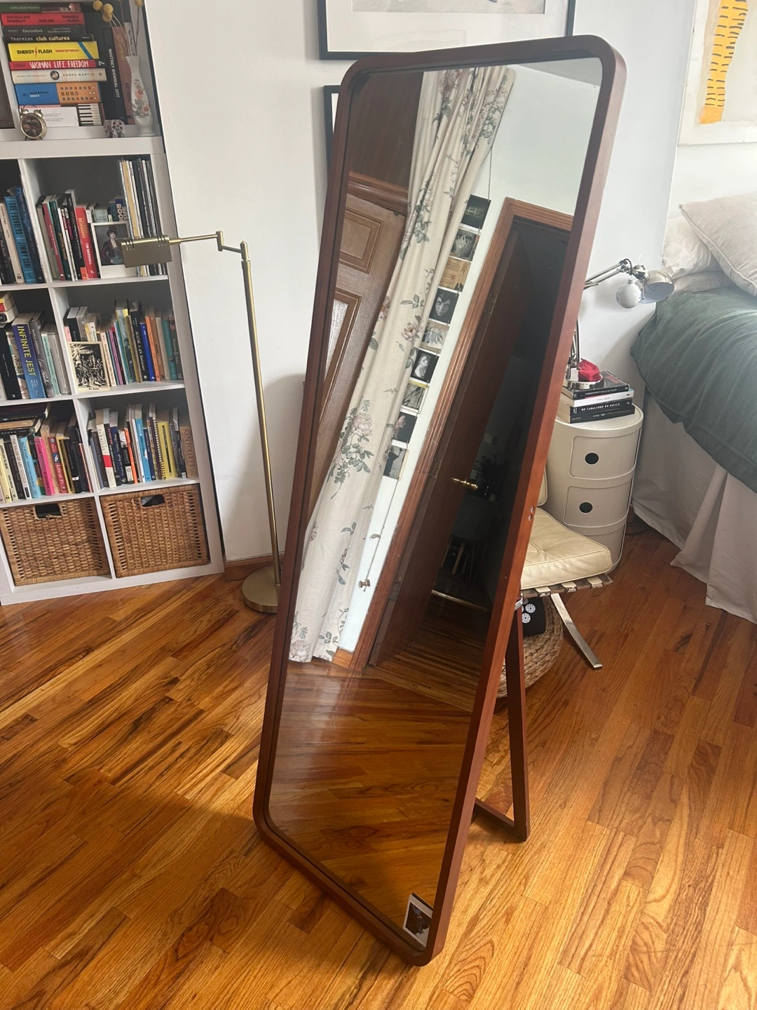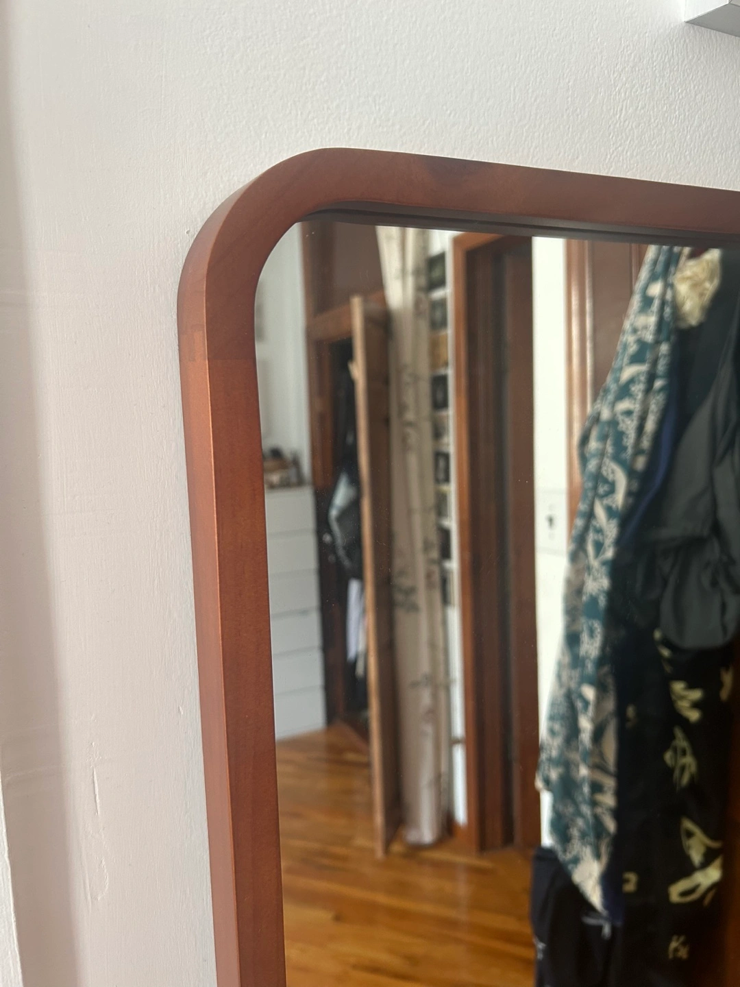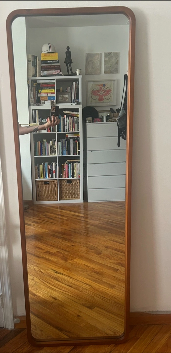 Walnut Wooden frame, full length mirror. The frame has rounded corners and stands by itself. This would be a great addition to any bedroom to complete the space. Can lay on the wall or on its stand