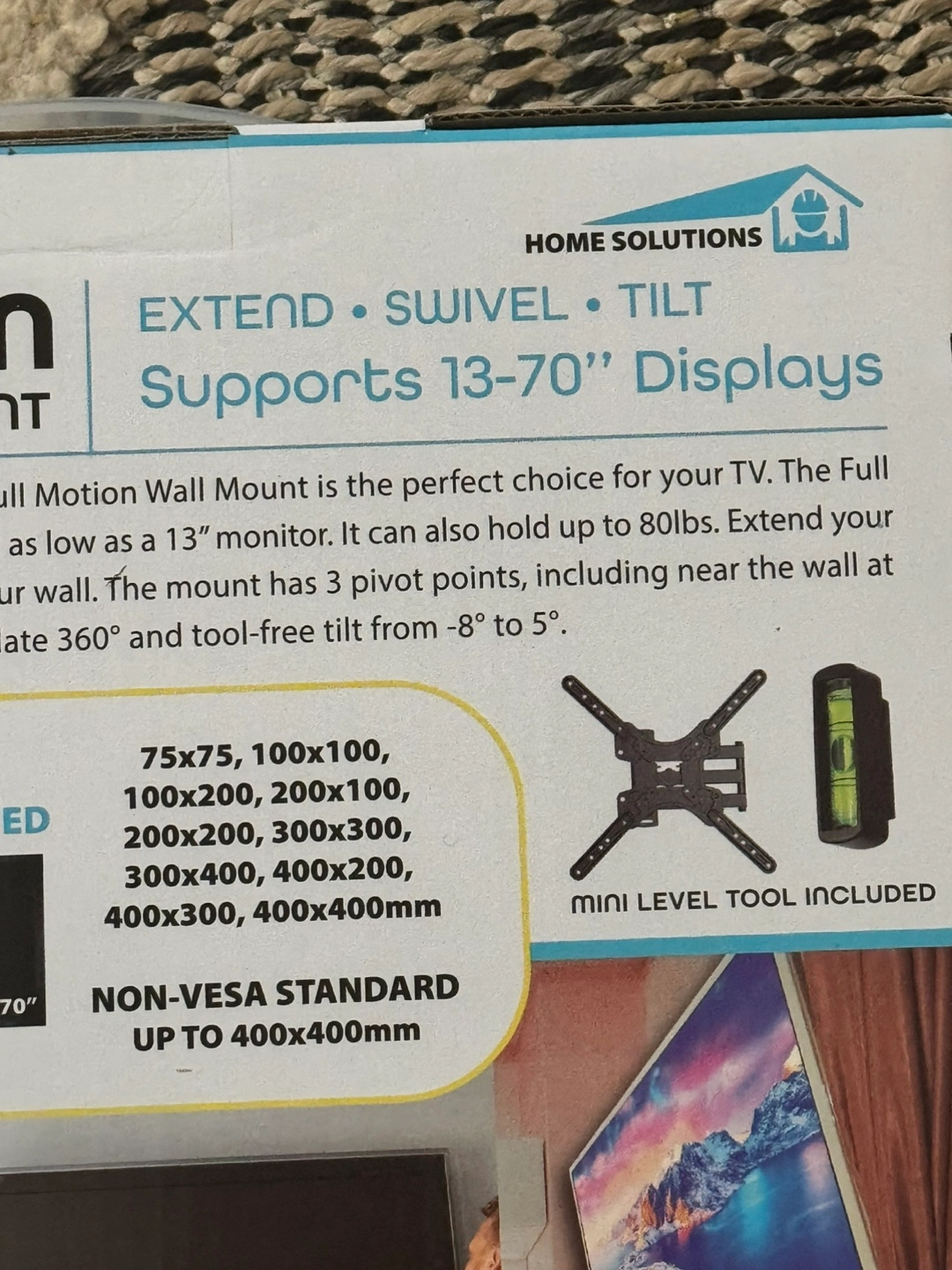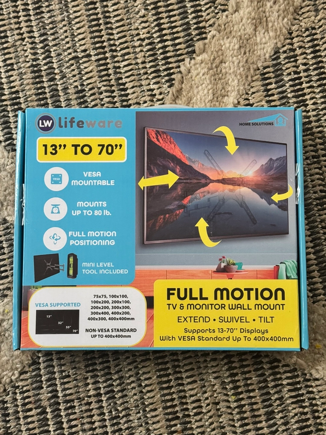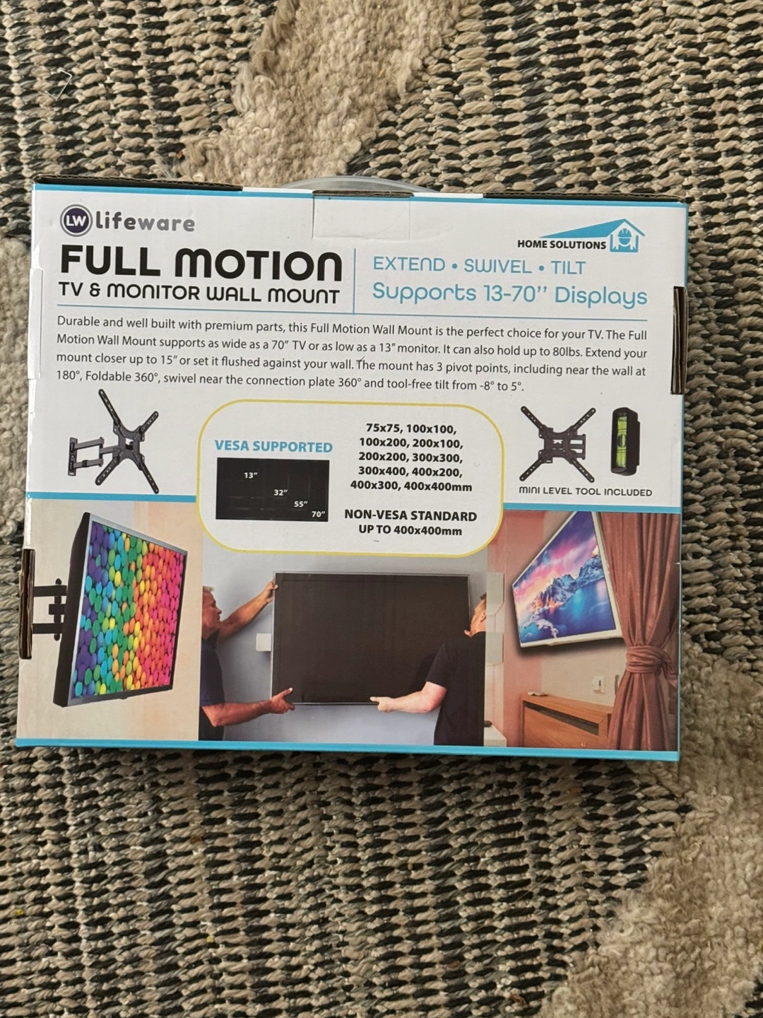 103Full motion TV wall mount. Supports 13-70" displays. Extends, swivels, and tilts. Holds up to 80 lbs. Includes mini level tool. VESA supported. A brand new and sealed Full Motion Monitor Or TV Wall Mount made of steel and can support weight of up to 88 pounds which basically means any size as the smart TV’s made today are so lightweight. I have an 86” LG TV mounted on this stand with no problem at all. It can extend your mount away from the wall by 15” or set it flush against the wall. The mount has pivot points at 180* foldable 360* swivel and tilt from -8* to +5*. It has connections for all VESA supported brackets starting from 75X75mm and even goes up to 400X400mm. All this comes from a virus free, smoke free and pet free home. Local pickup is available by Schaumburg and Barrington Road in Schaumburg IL 60194 or shipping is always an option too with one fixed cost to anywhere in the country with tracking included for free. Please check out my other 100 plus listings featuring even more deals and bargains at unbelievable prices which cannot be found in retail stores or on the web right now.