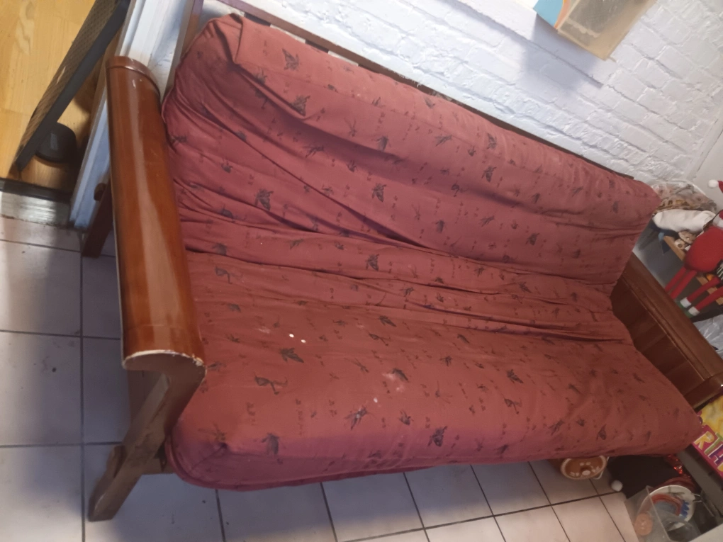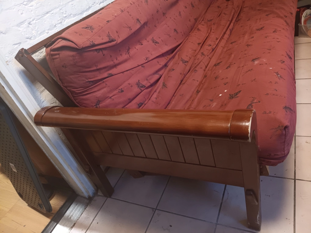 Selling a full-size futon sofa bed with a red patterned cover. It's in good condition and ready for a new home. Perfect for a guest room or small space!