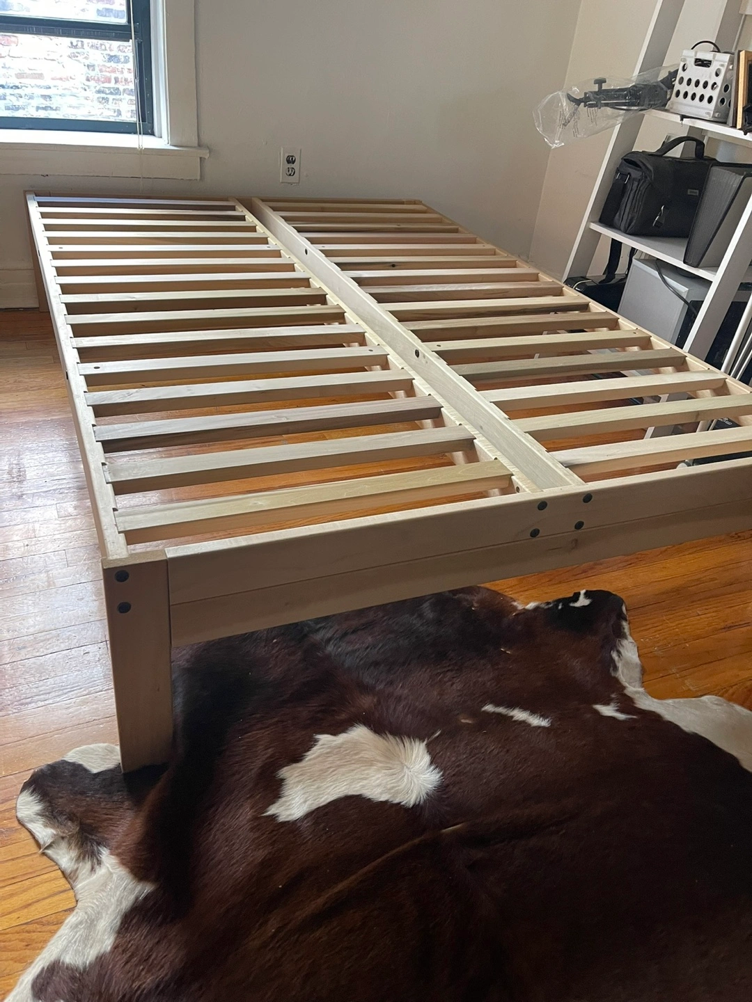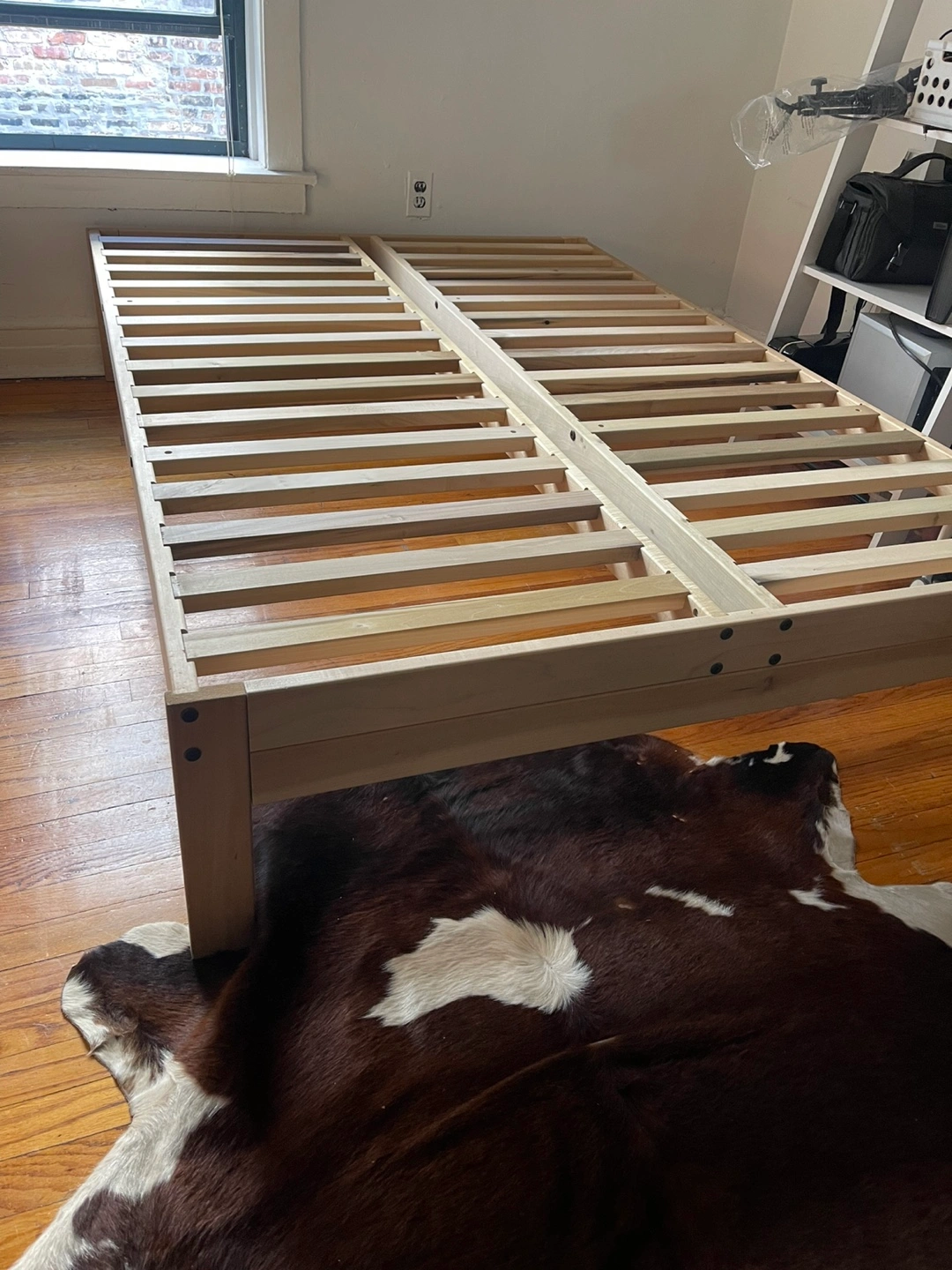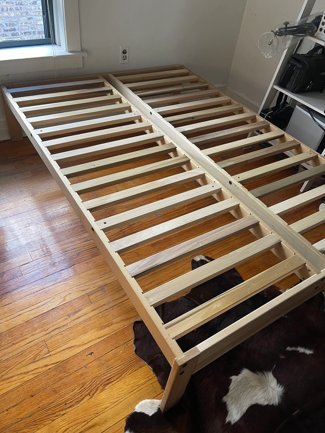 60Full size bed frame, solid wood. Includes mattress, in a white mattress protector cover. Also includes headboard. Simple design, easy assembly. 11-inches worth of space below the bed (lots of storage space)