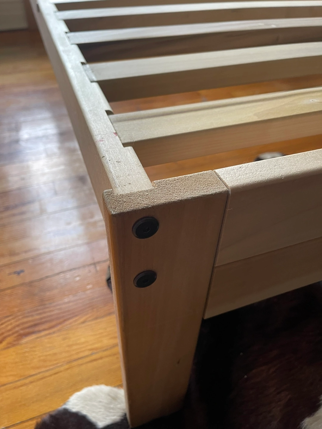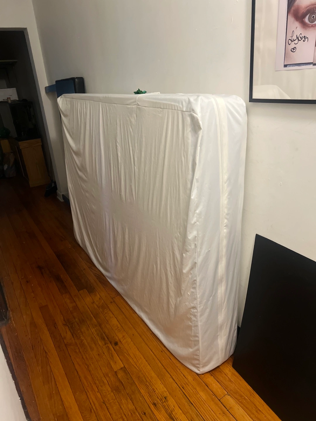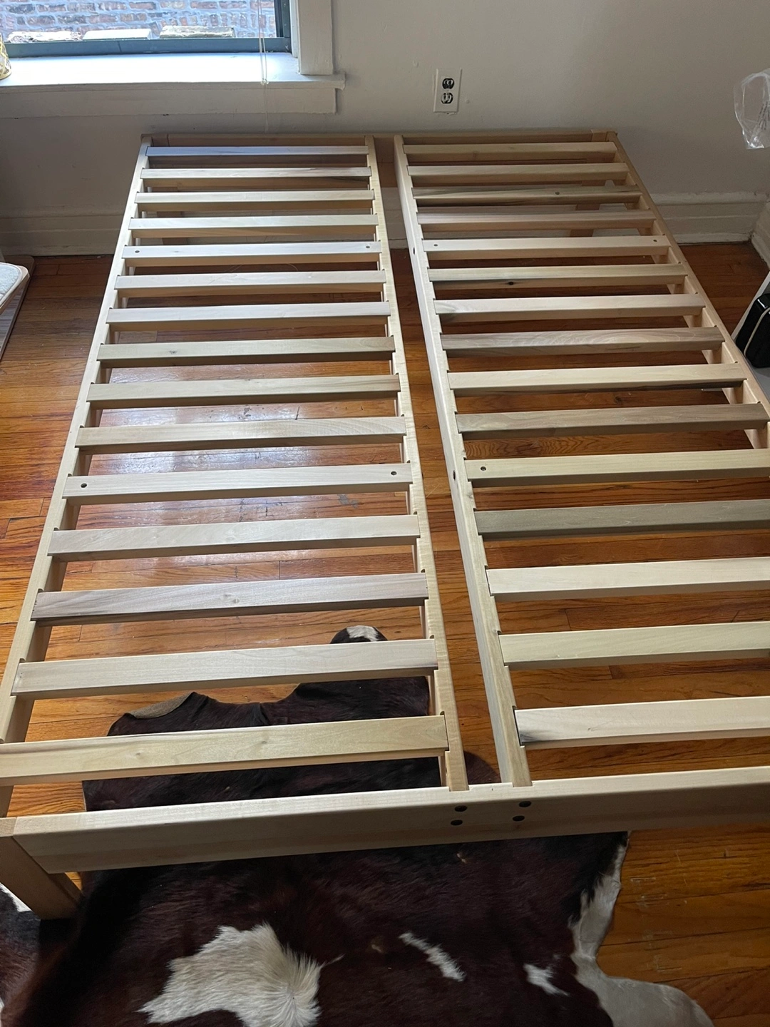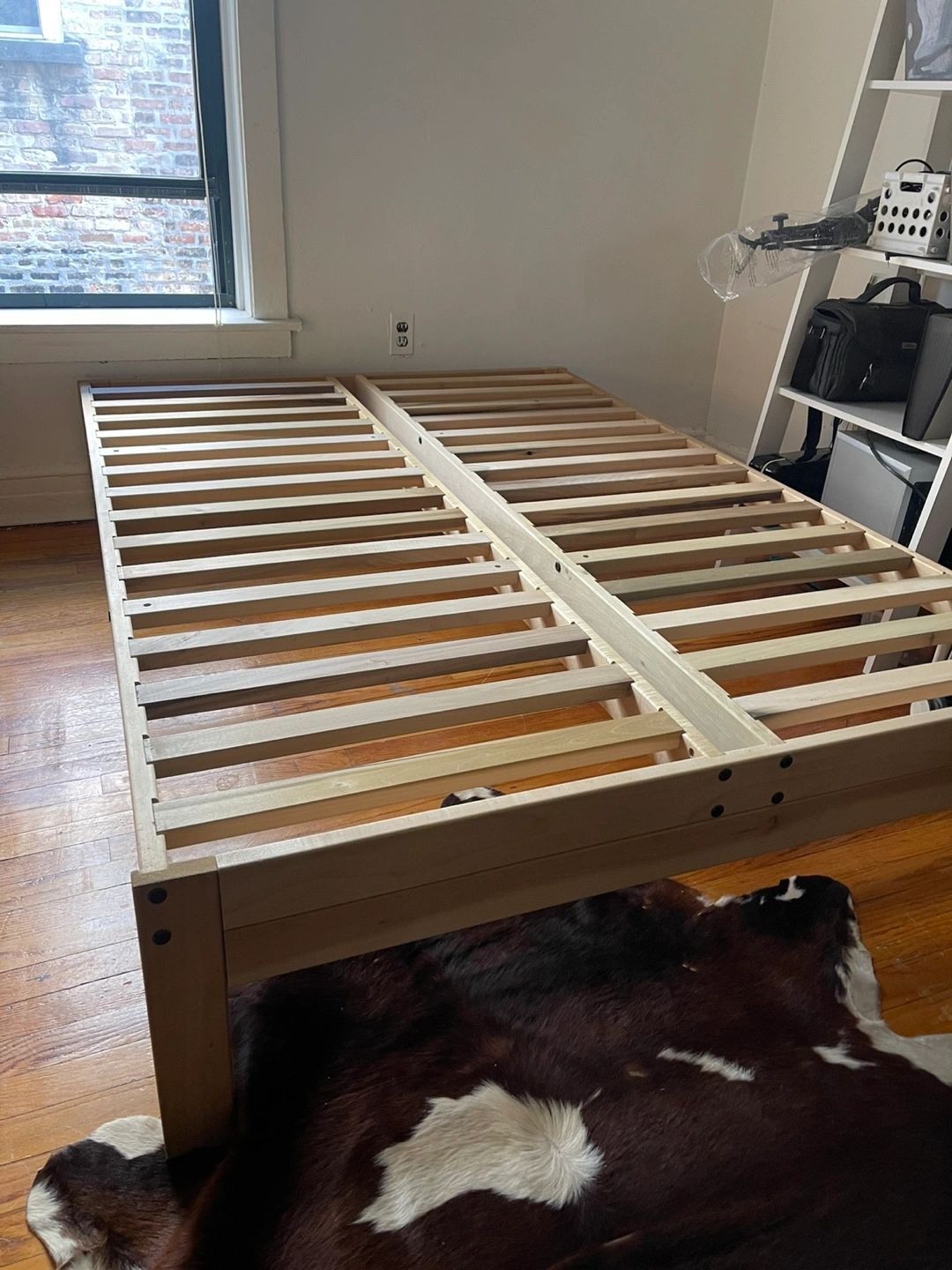60Full size bed frame, solid wood. Includes mattress, in a white mattress protector cover. Also includes headboard. Simple design, easy assembly. 11-inches worth of space below the bed (lots of storage space)