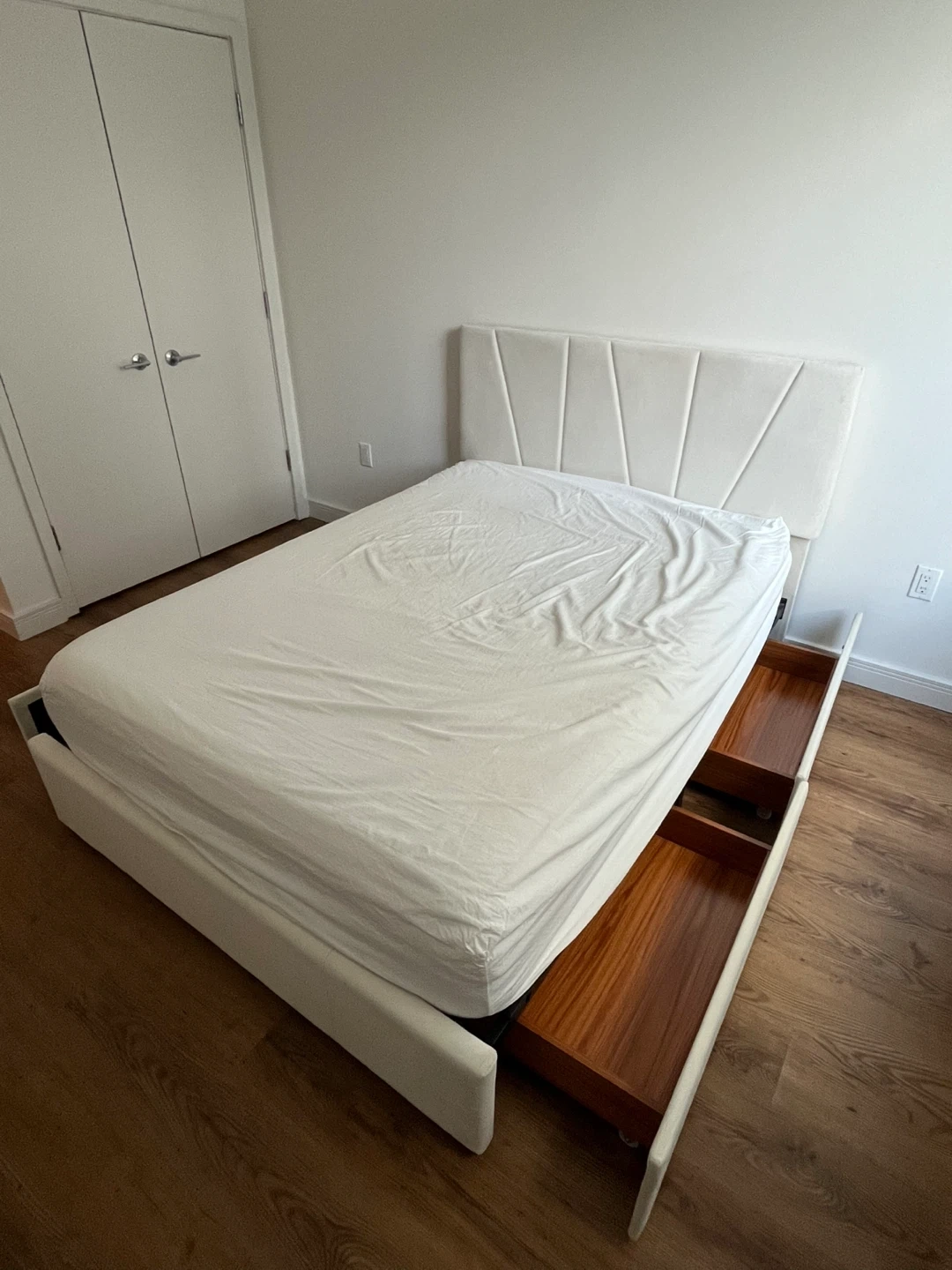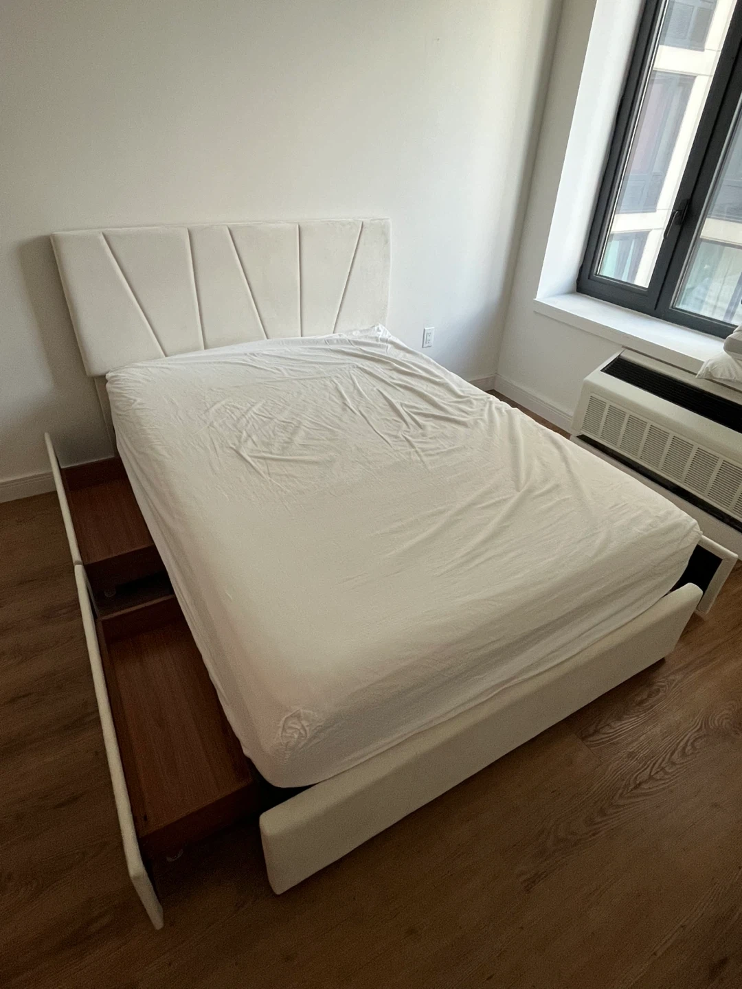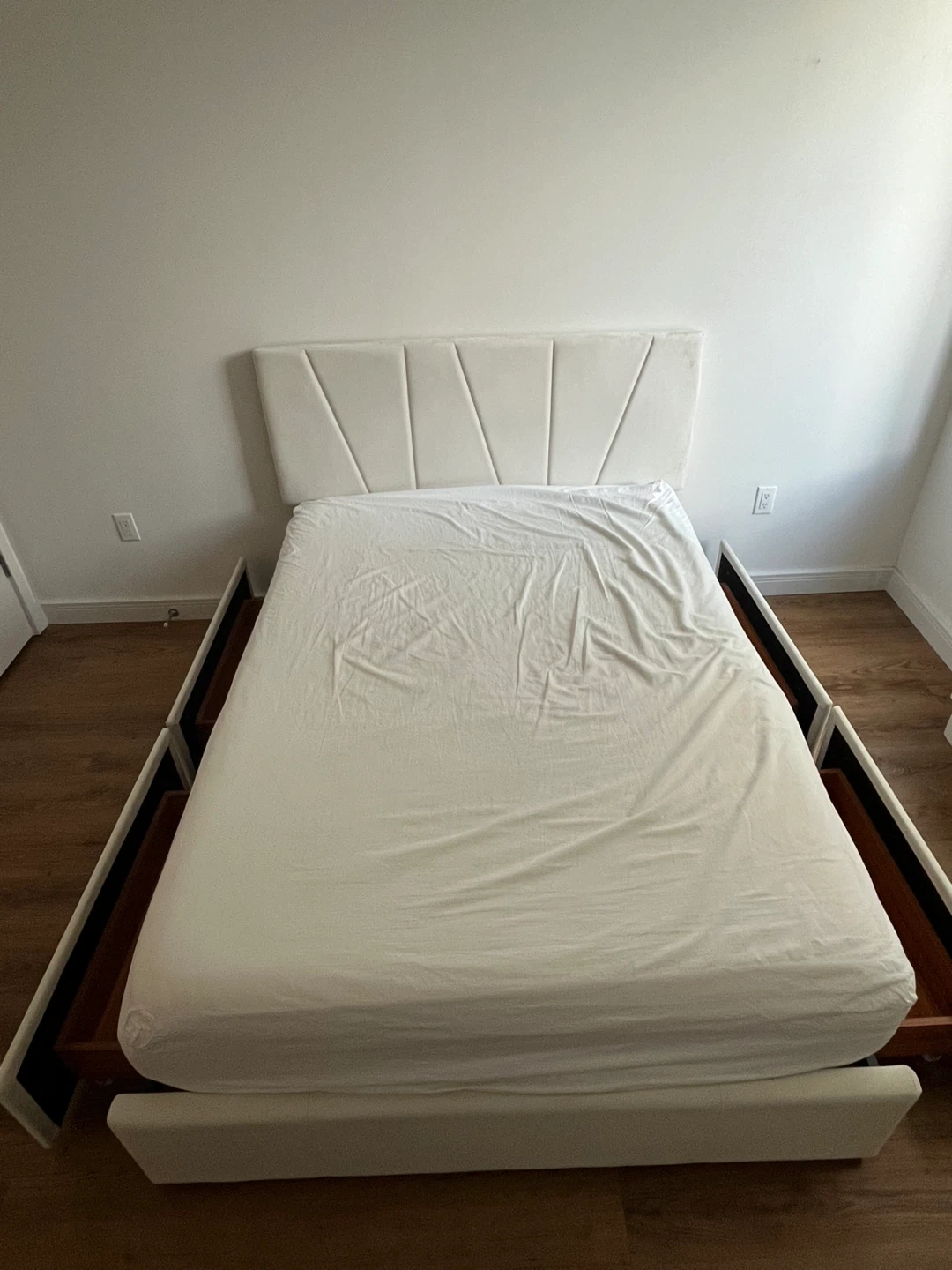 Mattress and bed frame are in good condition! It's full sized white and features a storage drawer underneath for extra space. Perfect for smaller rooms or anyone needing a bit more organization