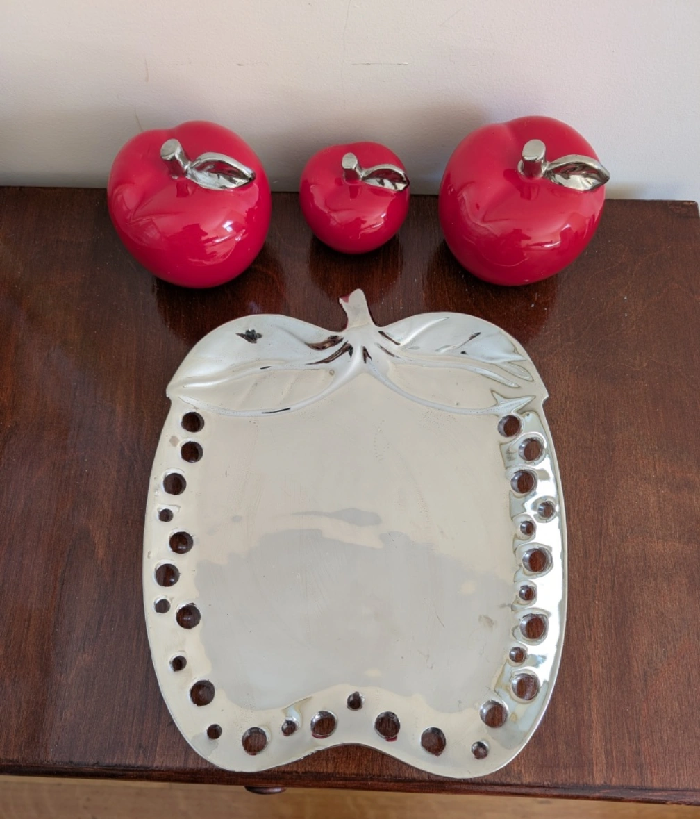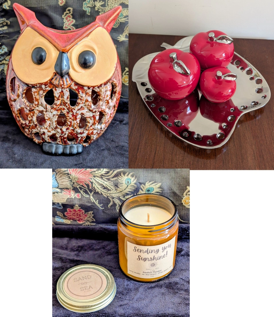 Add a pop of color and charm to your home with this unique bundle of decorative items! Great for a kitchen, living room, or as a gift. What's included: Red Apple Canister/Decor Set (3 pieces): Set of three glossy, bright red ceramic apples with shiny silver-tone stems/leaves. Includes a matching, large silver-tone metal tray/platter shaped like an apple. The tray is perfect for display, or for serving small items. Condition: Excellent, like-new display condition. Vintage-Style Ceramic Owl Tea Light Holder: A charming, rustic, terracotta-toned owl figurine with cutouts for a glowing tea light. Features a nice, warm glaze and big black eyes. Perfect for cozy lighting on a bookshelf or mantle. Condition: Great vintage condition, no chips or cracks. "Sending you Sunshine" Candle with "Sand & Sea" Tin: A lovely soy wax candle in an amber jar with a paper label that says "Sending you Sunshine!". Comes with a matching decorative tin labeled "SAND & SEA." Perfect for a little aromatherapy or as a thoughtful gift. Condition: Candle unused/new. Why buy this bundle? You get three distinct, fun home accents for one great price!