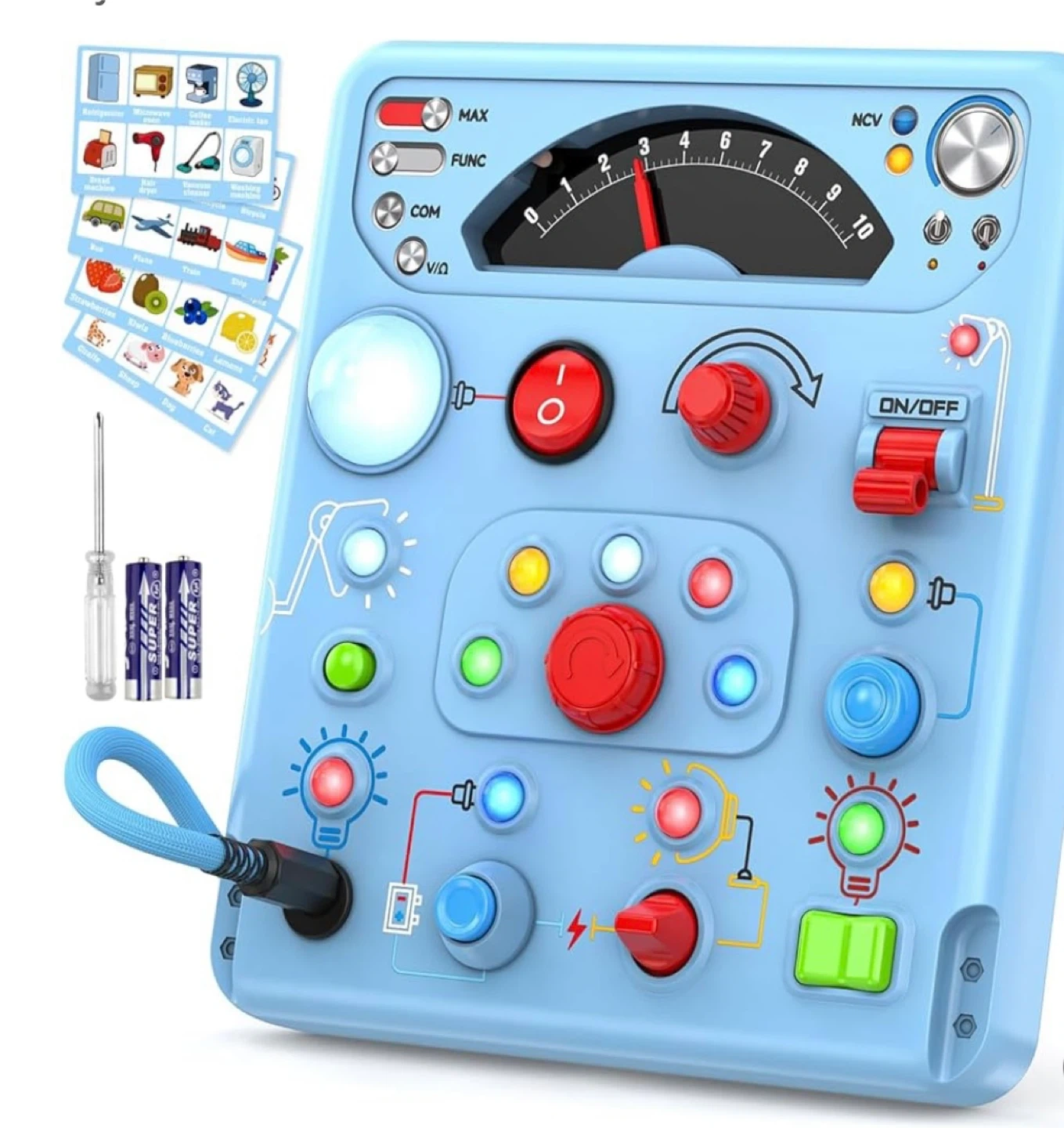 10This is a fun educational toy control panel with lots of buttons and lights! It comes with cards with pictures of everyday items. Also includes a screwdriver and batteries New in box