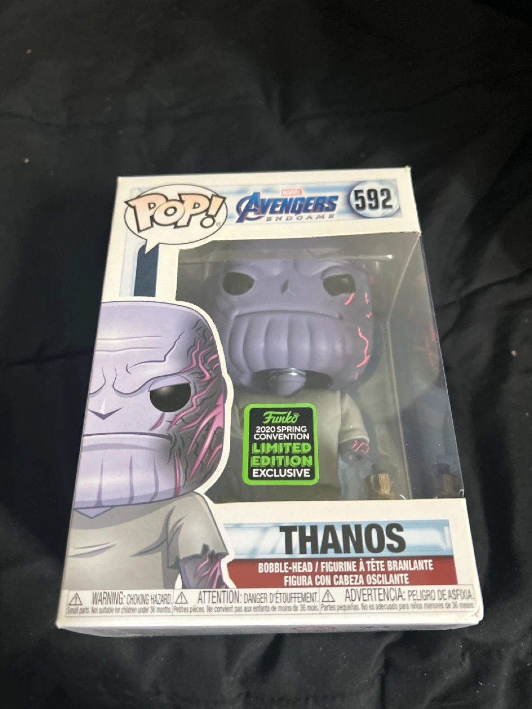 Selling a Funko Pop! figure of Thanos from Avengers Endgame. This is number 592 in the series and a 2020 Spring Convention Limited Edition Exclusive. It's a bobble-head figure and comes in its original box
