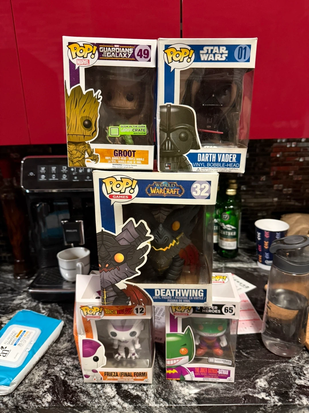 Selling a collection of Funko Pop! vinyl figures. Includes: - Guardians of the Galaxy Groot #49 (Glow in the Dark Loot Crate Exclusive) - Star Wars Darth Vader #01 - World of Warcraft Deathwing #32 - Dragon Ball Z Frieza (Final Form) #12 - Heroes The Joker Batman-Batman #65 (Loot Crate)