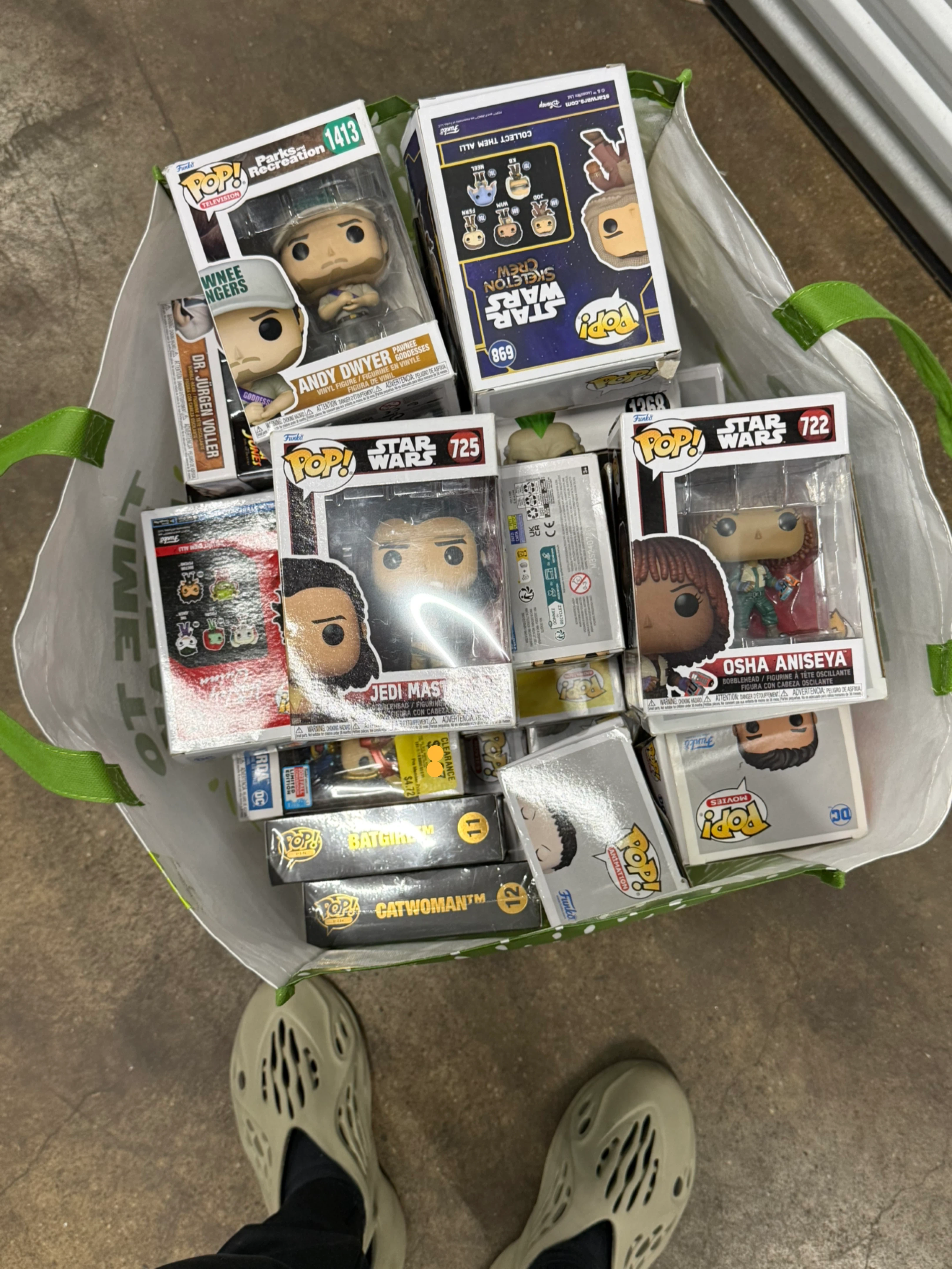 5Selling a collection of Funko Pop! vinyl figures, including characters from Star Wars, DC, and Parks & Recreation. Figures include Andy Dwyer (Parks & Recreation #1413), Skeleton Crew (Star Wars #869), Jedi Master (Star Wars #725), Osha Aniseya (Star Wars #722), Batgirl (#11), and Catwoman (#12)