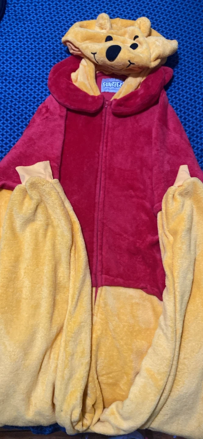 Funziez Winnie the Pooh adult onesie, perfect for lounging around or Halloween! The onesie features a hood with Pooh's face and is made of soft, plush material. It's in great condition and ready for a new home