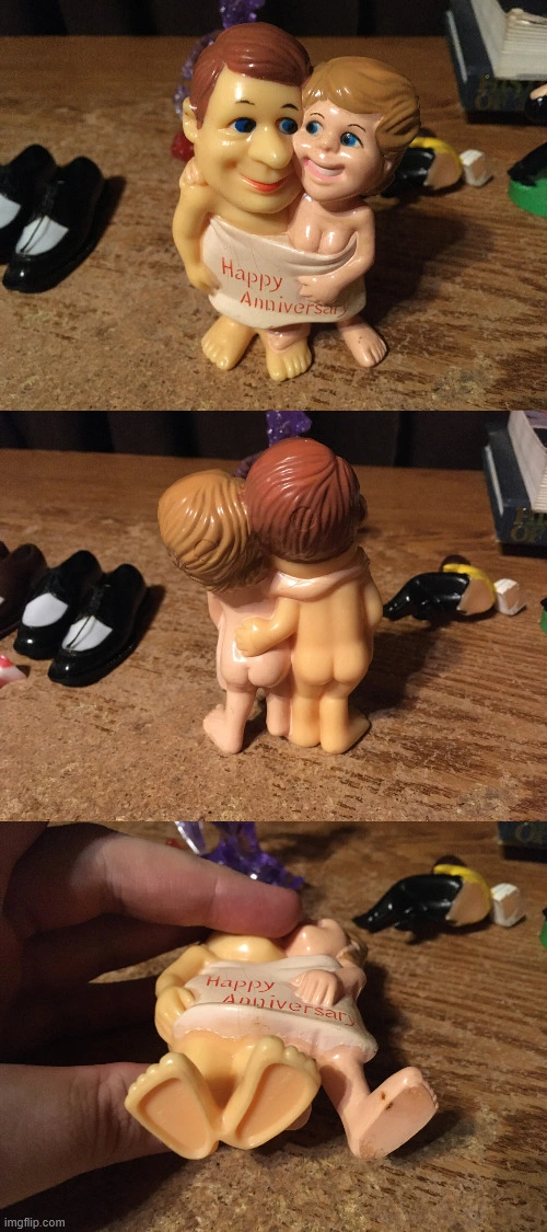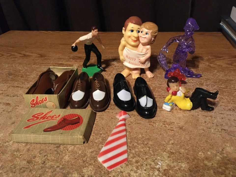There is a figure of a couple hugging with a 'Happy Anniversary' banner, and various other figures. These items are perfect for decoration, and they look great when displayed on a shelf. there's three pairs and a tie for children endeavor cake topper, 1971 Russ Wallace happy anniversary couple, Wilton 4-in bowler man, Wilton cake topper boy on the phone from the '50s or '60s, and a 4-in and 1 and 1/2 in clown with umbrella pick up at house