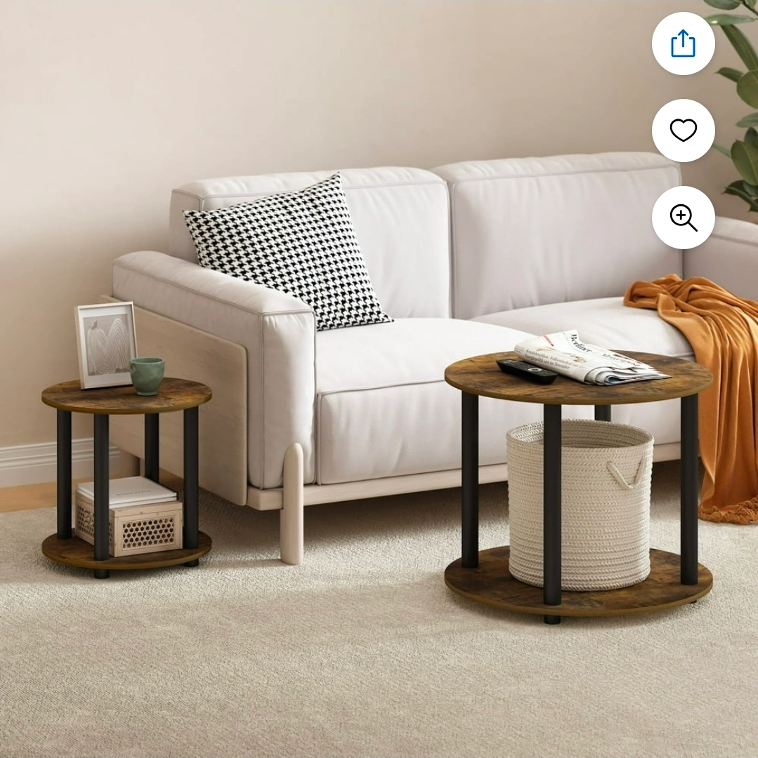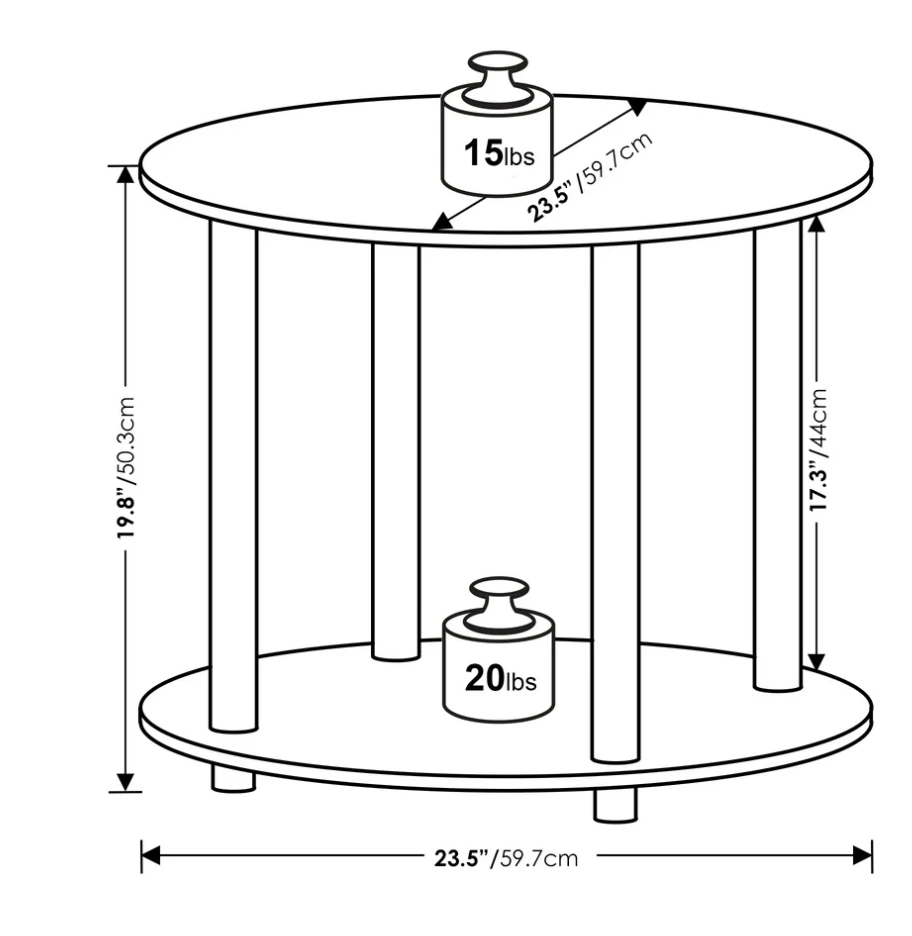 81This round side table is perfect for any living room or bedroom! It features a storage shelf and a sturdy construction. The table has a rustic brown finish with black legs. It's 23.5 inches in diameter and 19.8 inches tall.