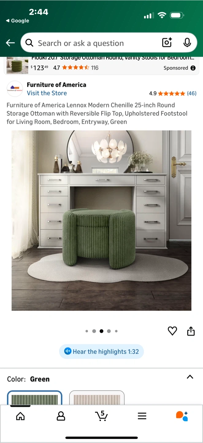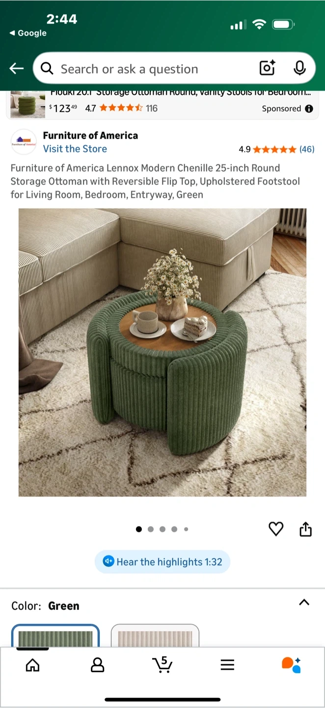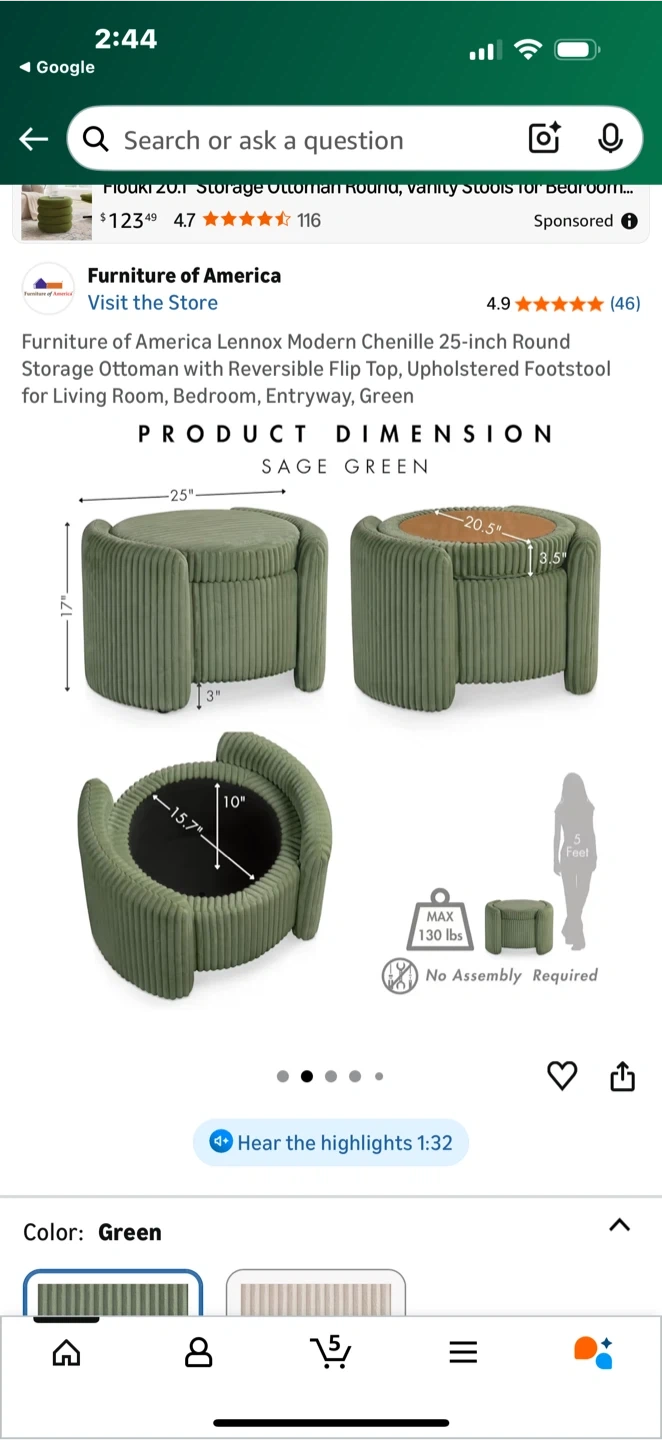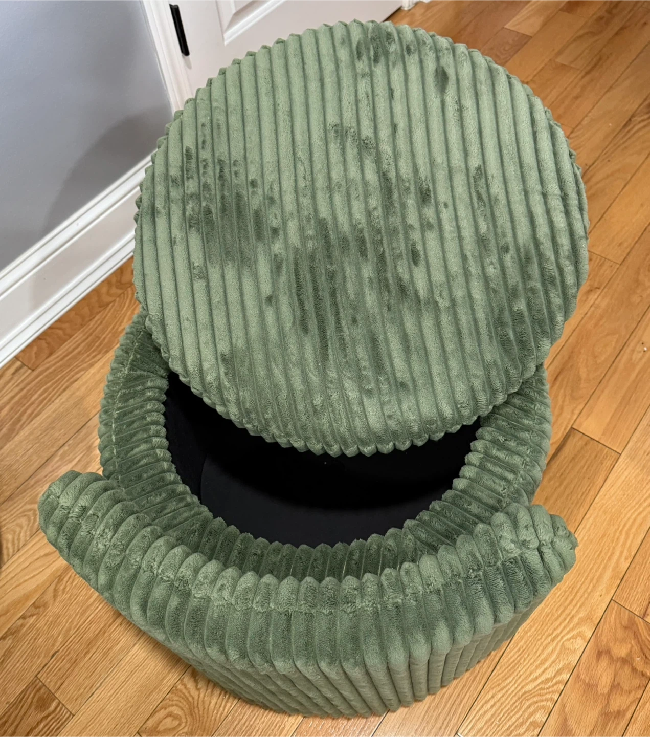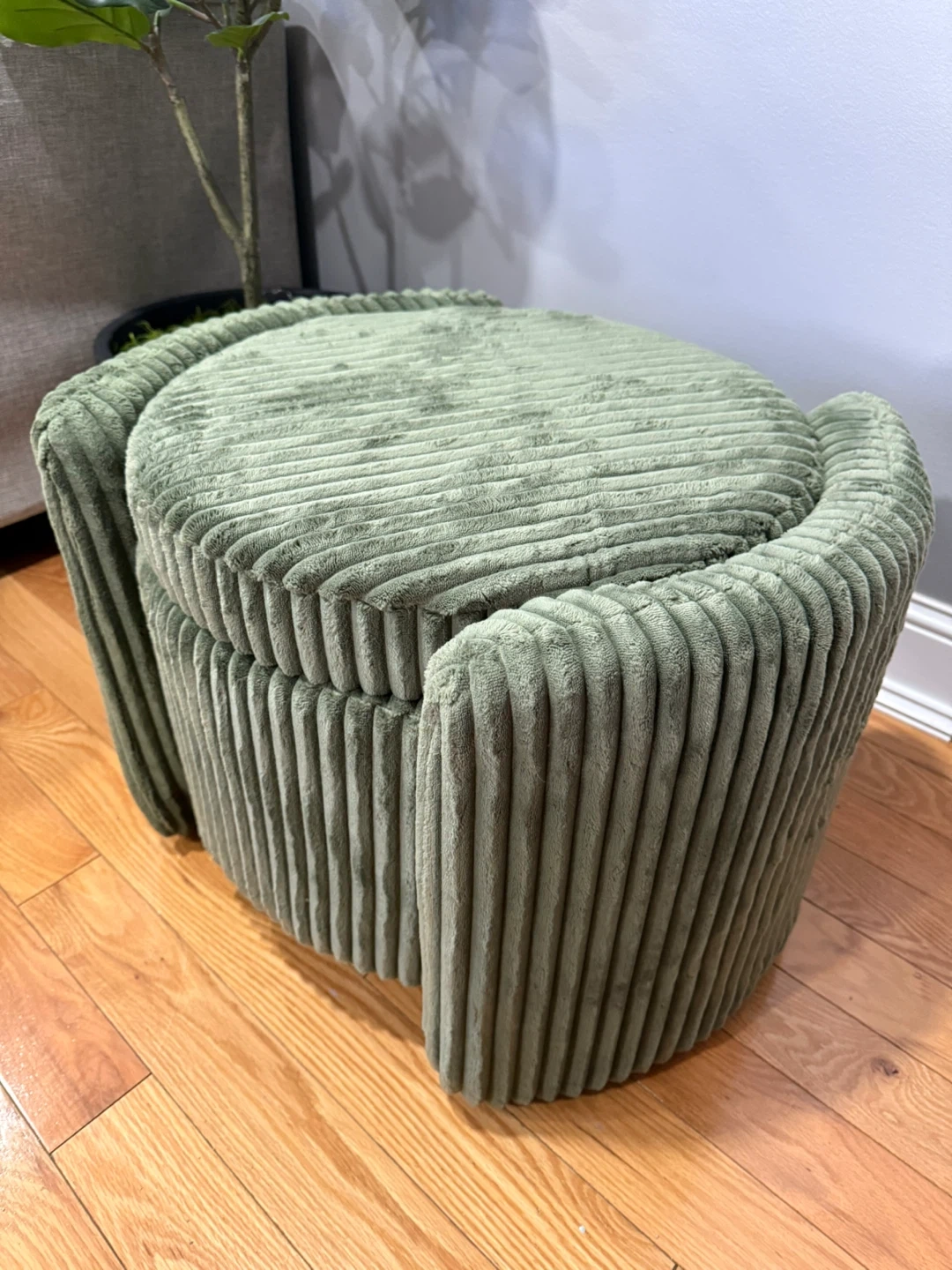 67This is a Furniture of America Lennox modern chenille 25-inch round storage ottoman. It features a reversible flip top and is upholstered. The color is a sage green. Product dimensions: - 25 inches wide - 17 inches tall - Can hold up to 130 lbs