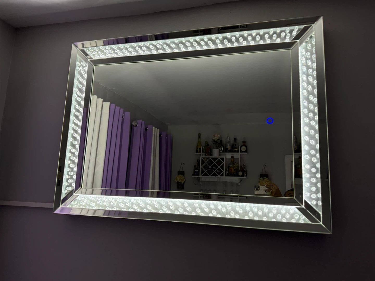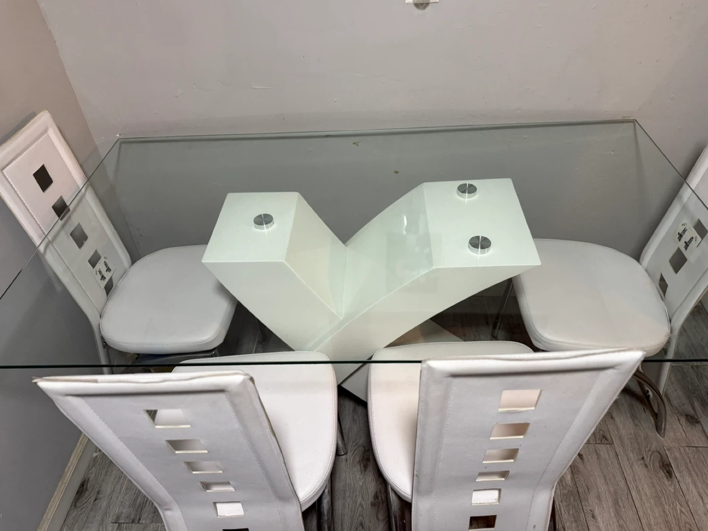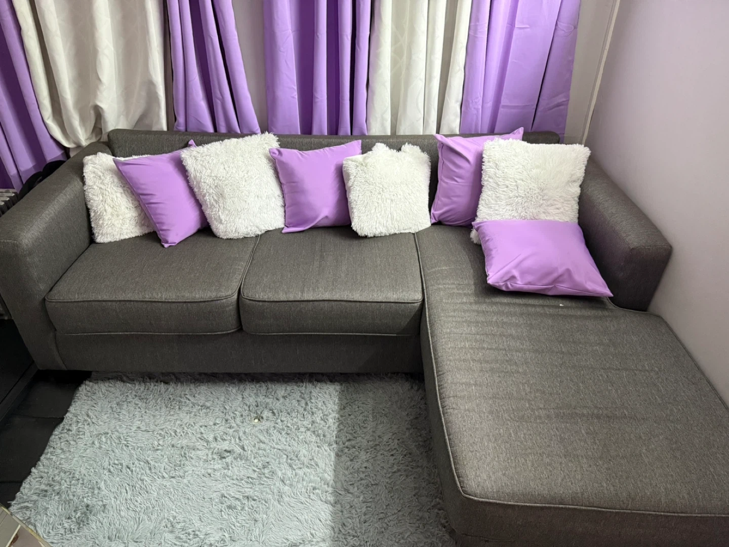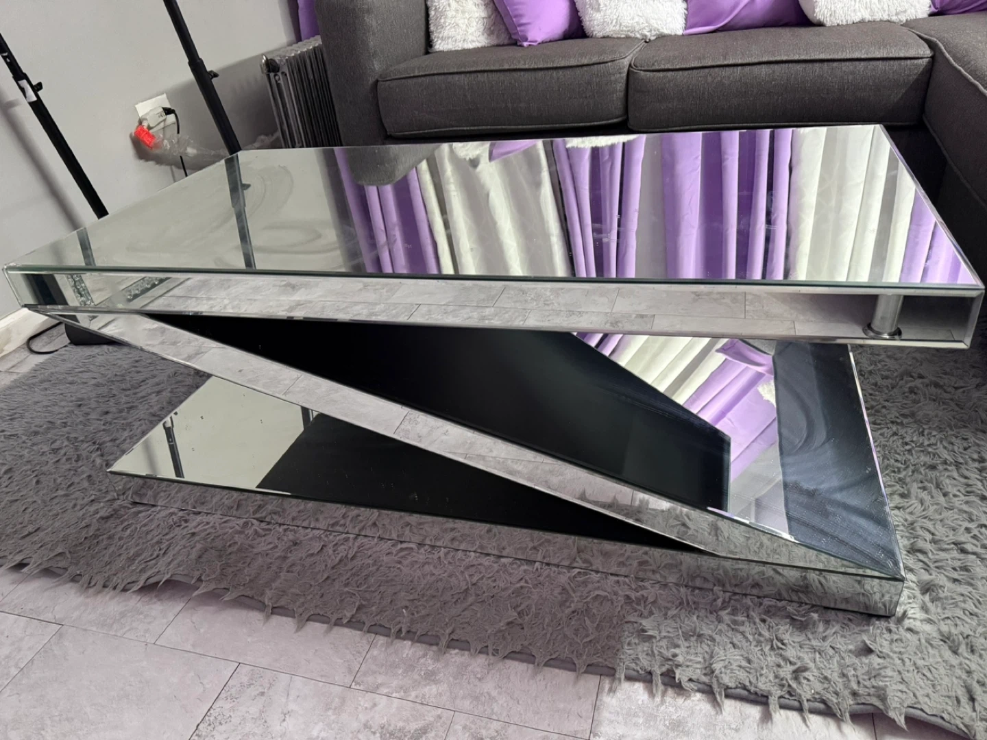 Selling a furniture set that includes a gray sofa with purple and white pillows, a mirrored coffee table, a lighted mirror, and a white dining table with four chairs. All items are in good condition and ready to find a new home