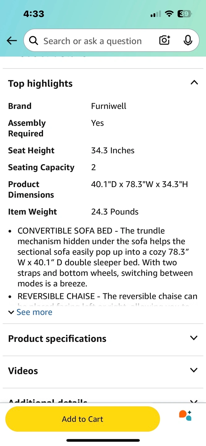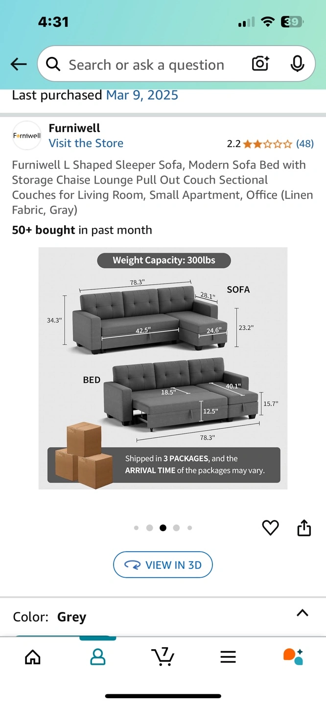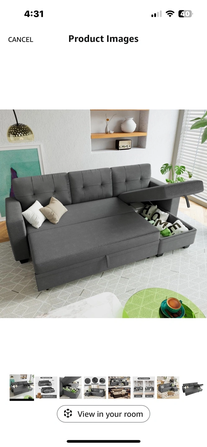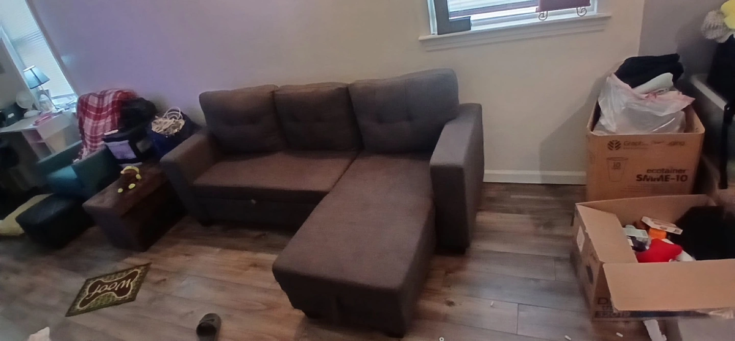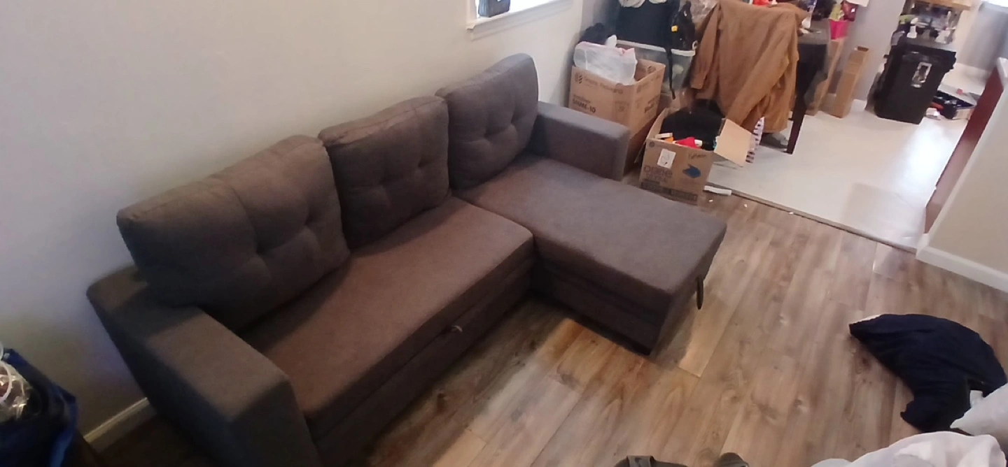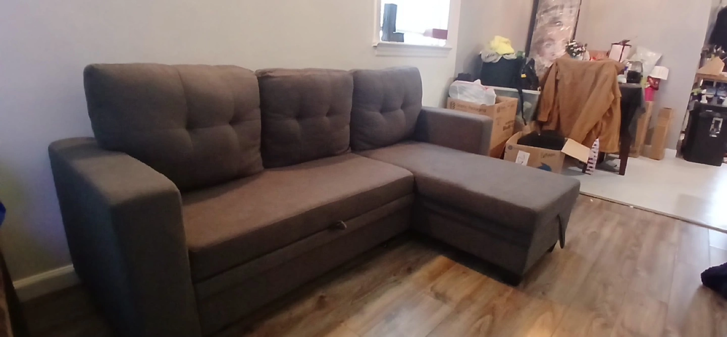 97L-shaped sofa bed with storage. Modern design. Pull-out couch. Linen fabric. Gray color. Great for apartments or offices.linen fabric. Brand new. Never used. Too small for my apartment. Original price 350$