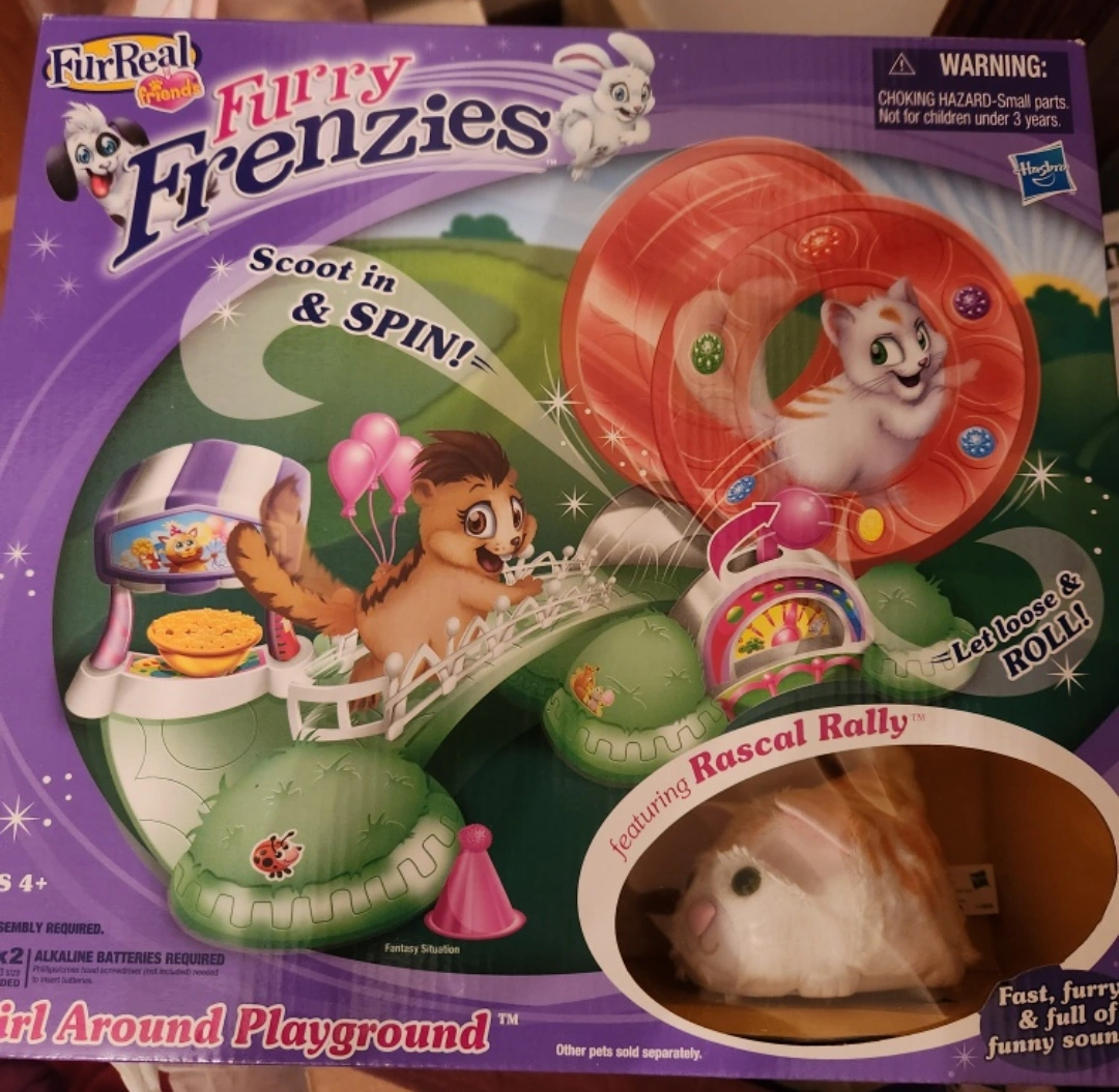 Selling a FurReal Friends Furry Frenzies Whirl Around Playground! It's suitable for ages 4 and up. This set includes the Rascal Rally and features a fun, interactive design where the pets can scoot in and spin! Get ready for fast, furry, and full of funny sounds!