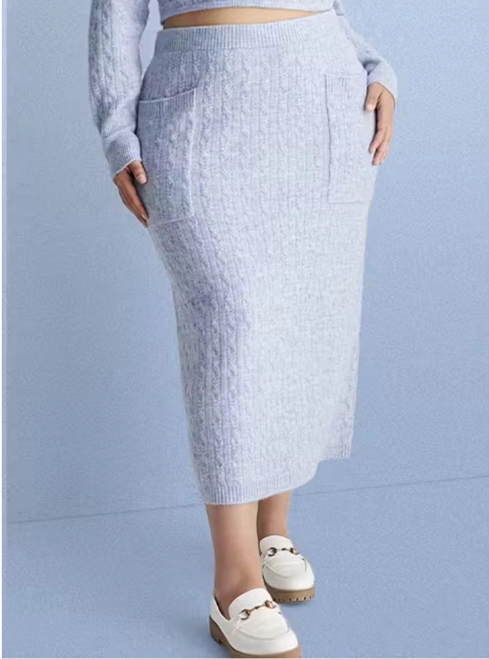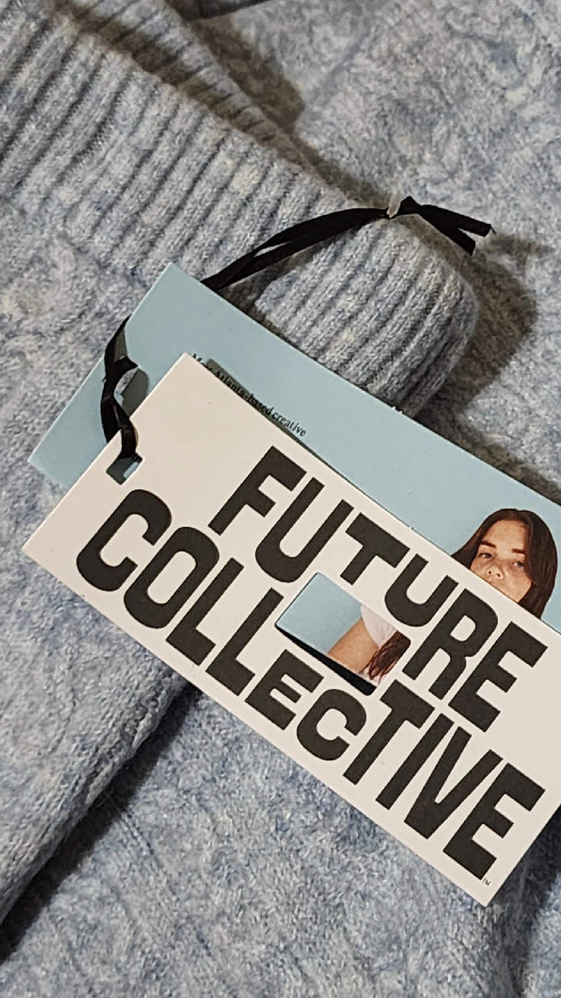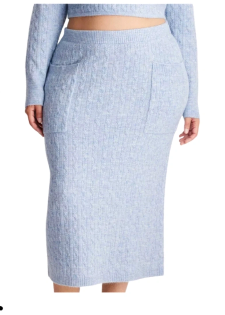 Here's a brand new Future Collective cable knit skirt! It's a beautiful light blue color and a size 3X. Perfect for adding a cozy and stylish touch to your wardrobe. Perfect for wearing during fall/winter