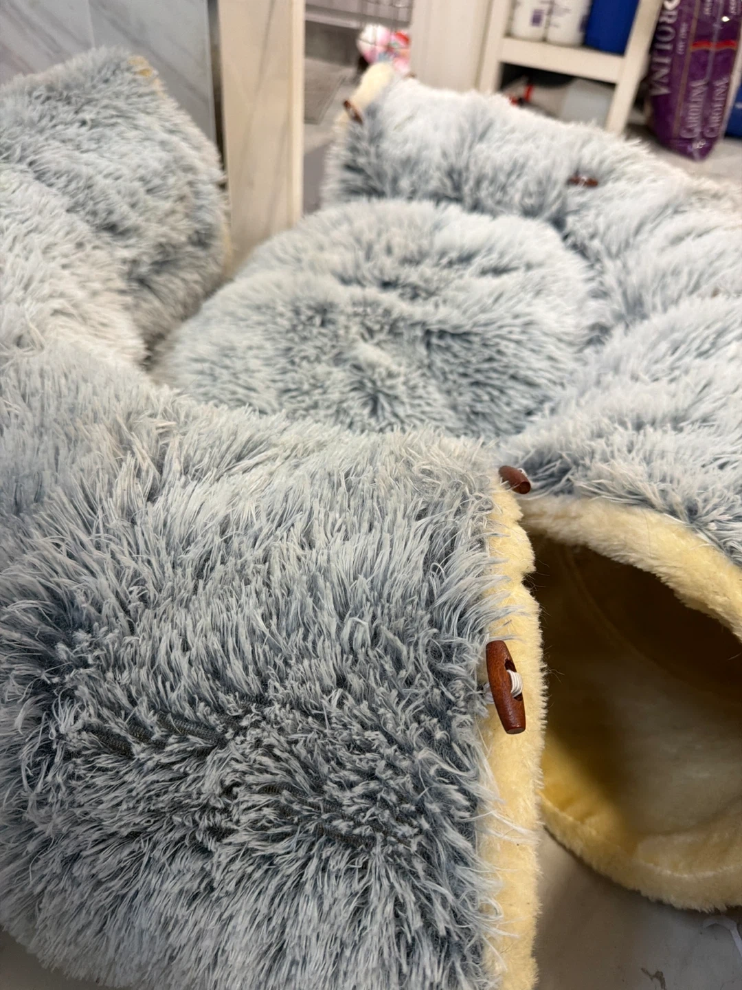 5Here's a cozy fuzzy pet bed/ tunnel. It is gray and has a cave-like structure with a soft, plush interior. Your cat will love snuggling up and playing inside :)