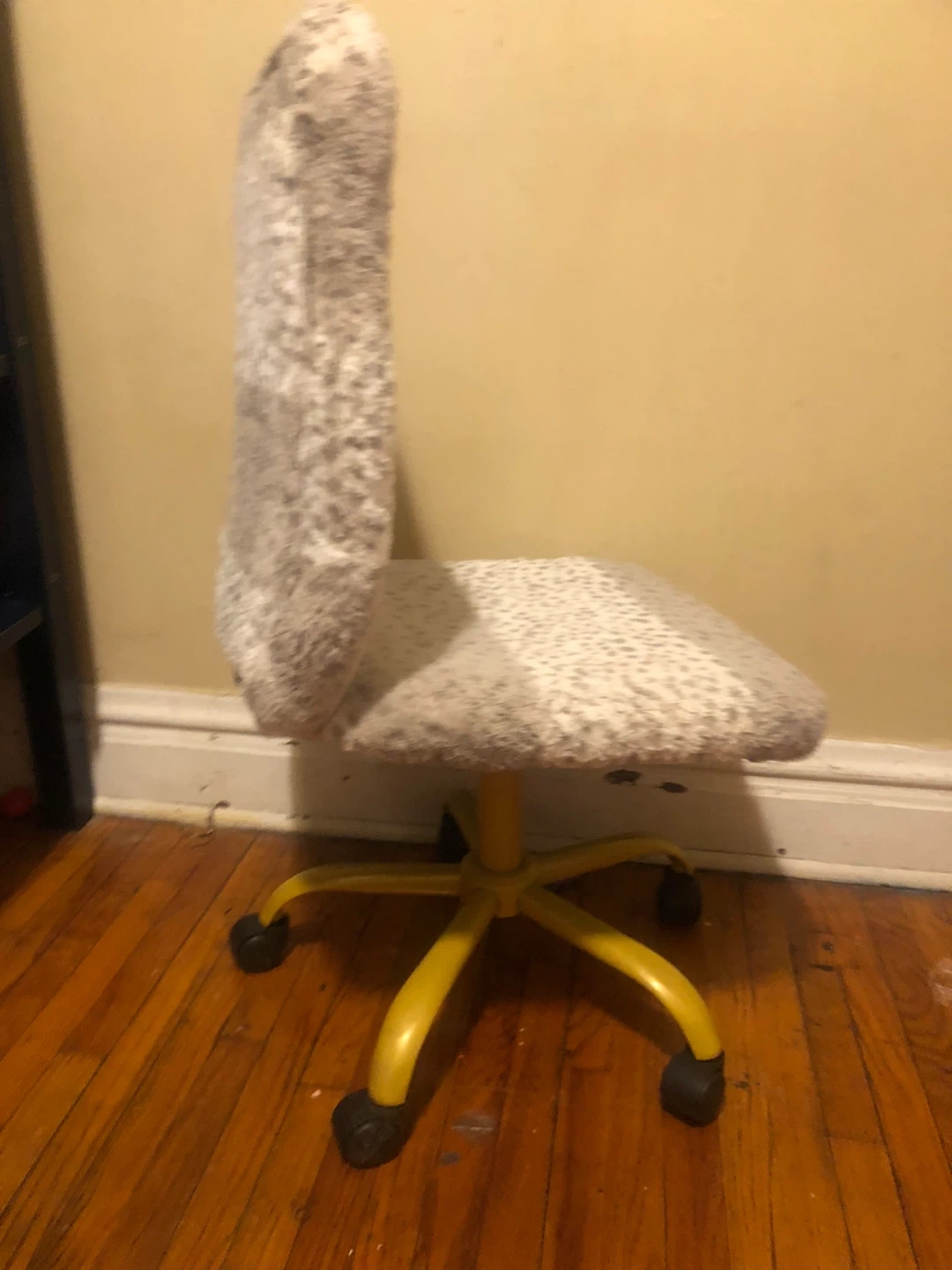 60This is a super cute and comfy swivel desk chair! It features a fuzzy material with a fun, spotted pattern. The chair has a yellow base and is perfect for adding a touch of style to your workspace or bedroom. It's in great condition and ready for a new home!