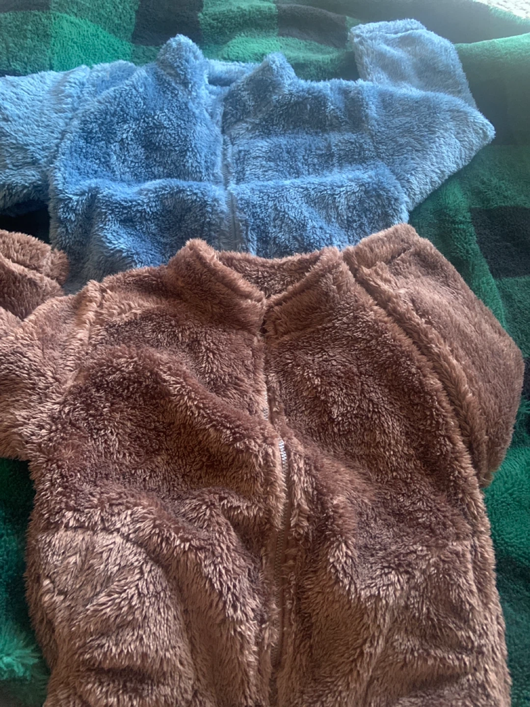 Selling two cozy fuzzy zip-up jackets! One is a soft blue, and the other is a warm brown. Perfect for layering or just lounging around the house
