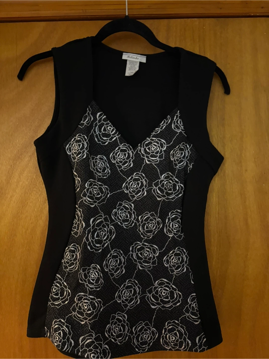 This Belinda top features a black base with a white rose print on the front panel. It's made of 95% polyester and 5% spandex. Size medium.