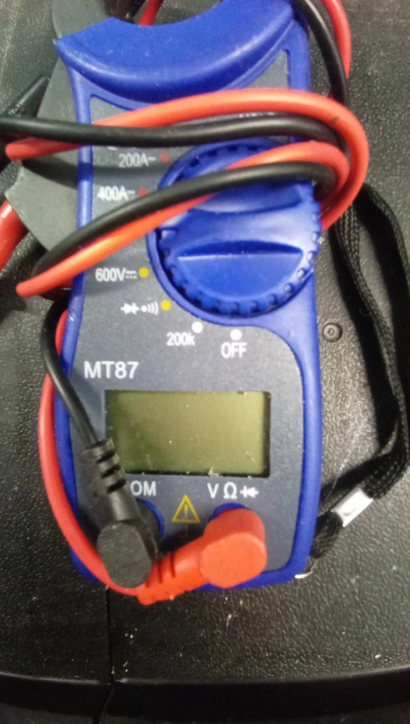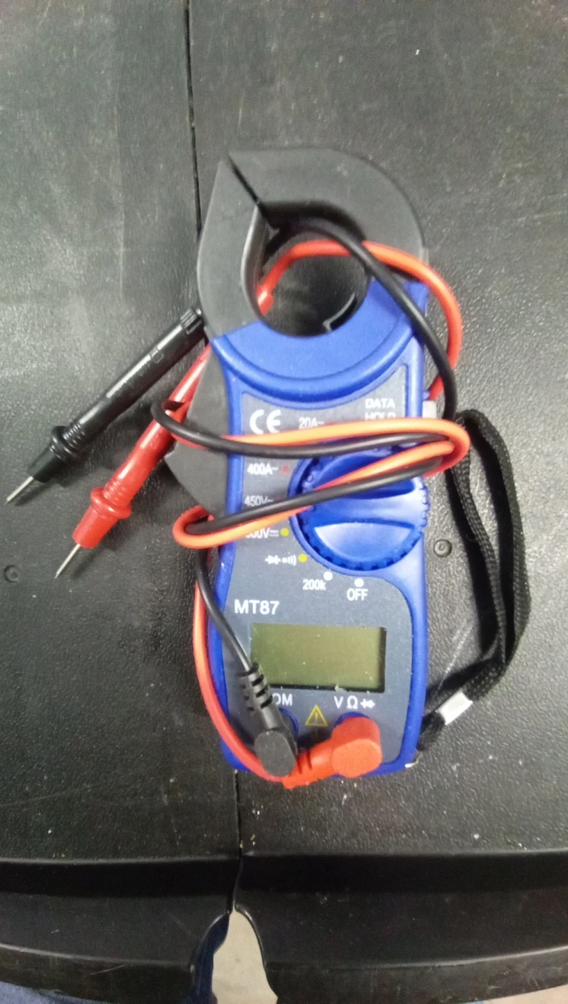 This is a MT87 digital clamp meter multimeter. It has a blue casing and includes red and black test leads. Power supply is AAA 1.5V x 2 battery. It's rated CAT.II 600V.
