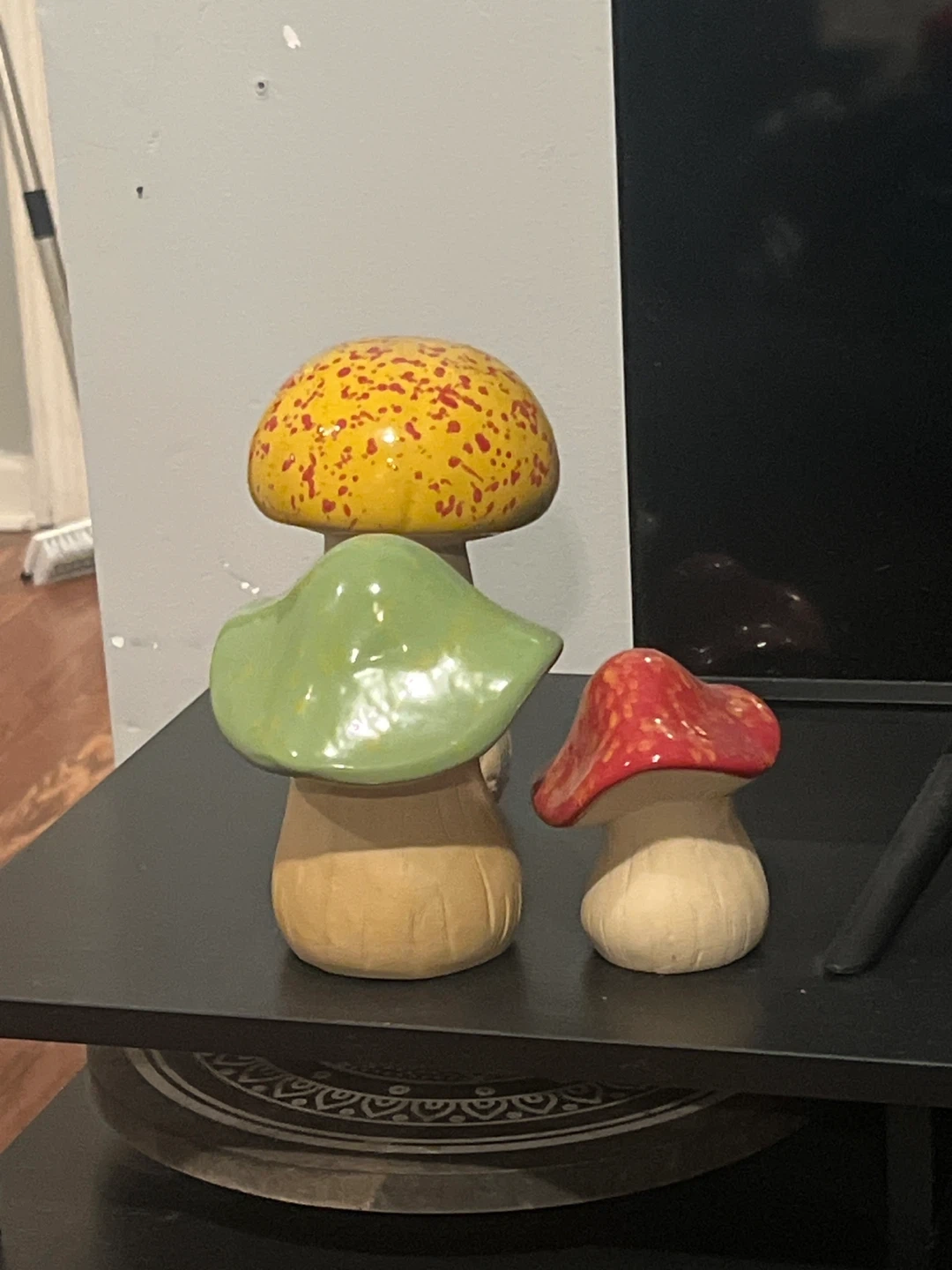 Three cute ceramic mushroom figurines stacked together. One has a yellow cap with red speckles, another a green cap, and the smallest has a red cap with white speckles. They're perfect for adding a whimsical touch to shelves or tabletops!