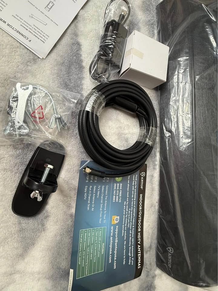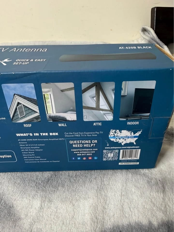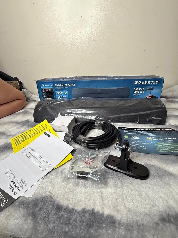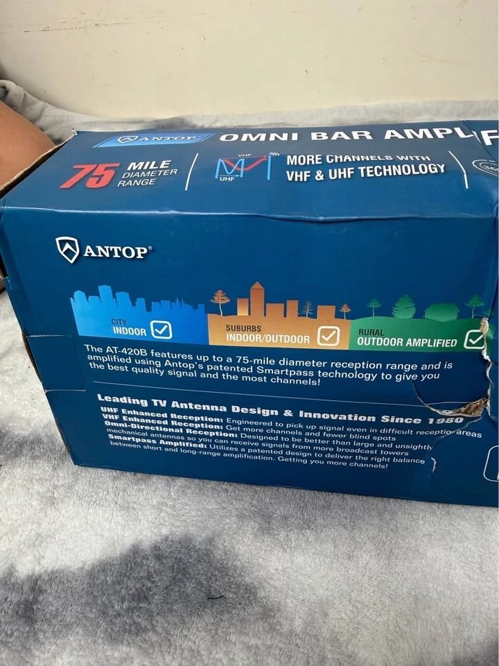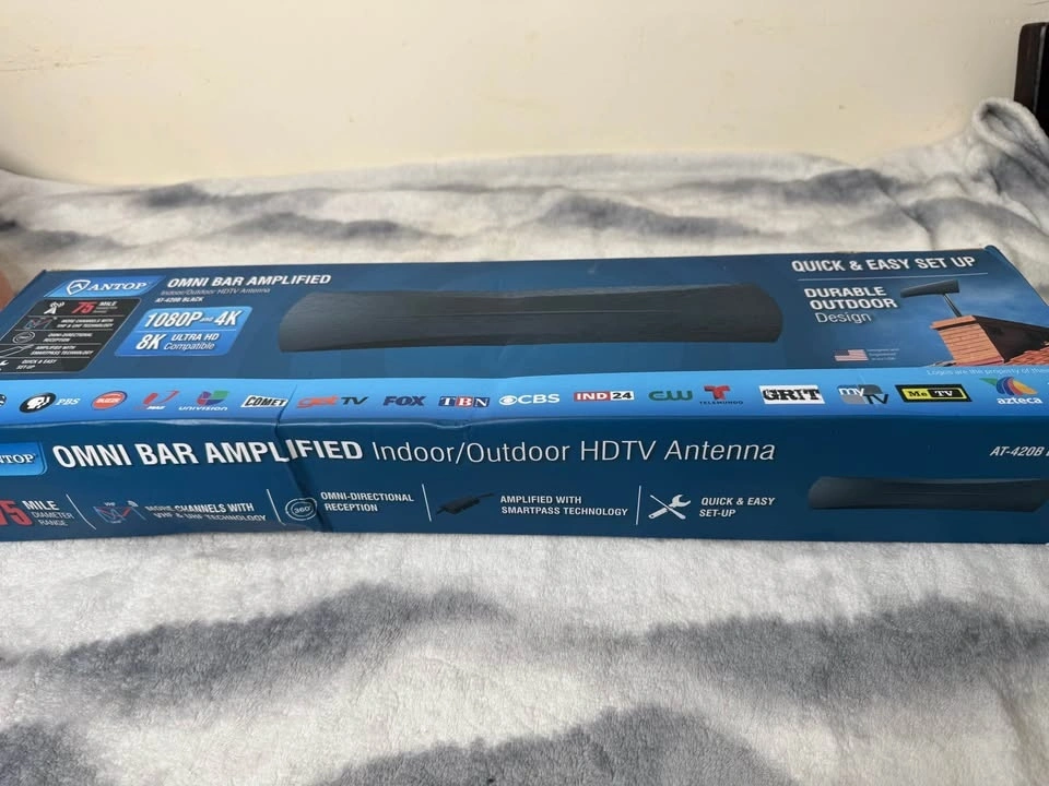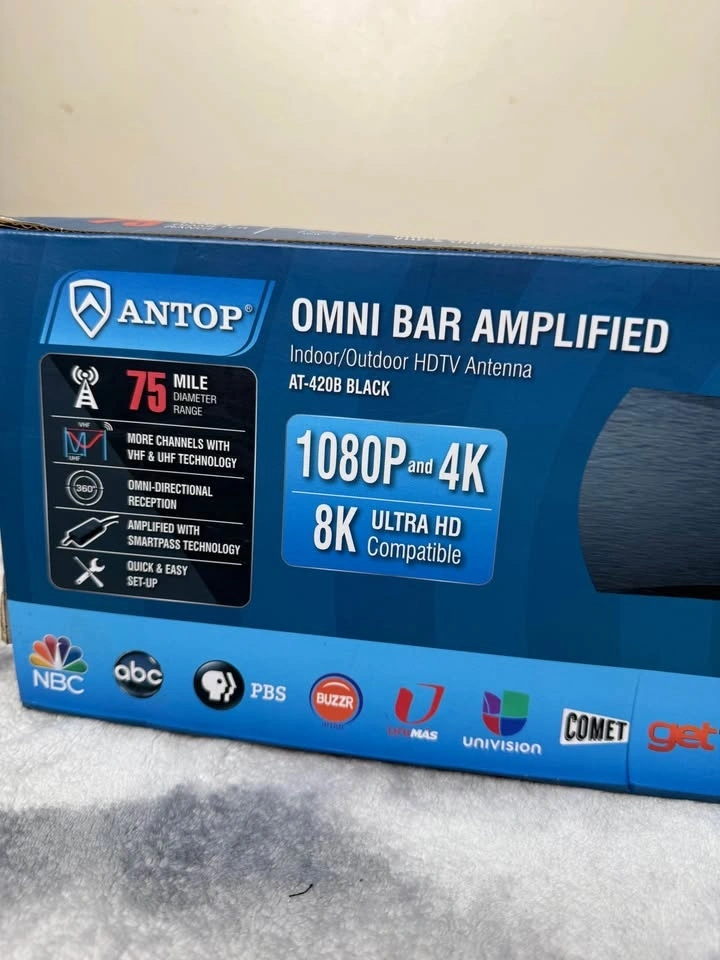 Receives HD TV signals up to 75 miles away. Designed for indoor or outdoor use with a weather and UV resistant finish. Features amplified Smartpass technology and a built-in 4G/5G LTE filter to reduce interference. Supports up to 4K resolution and is compatible with multiple TVs in the home.