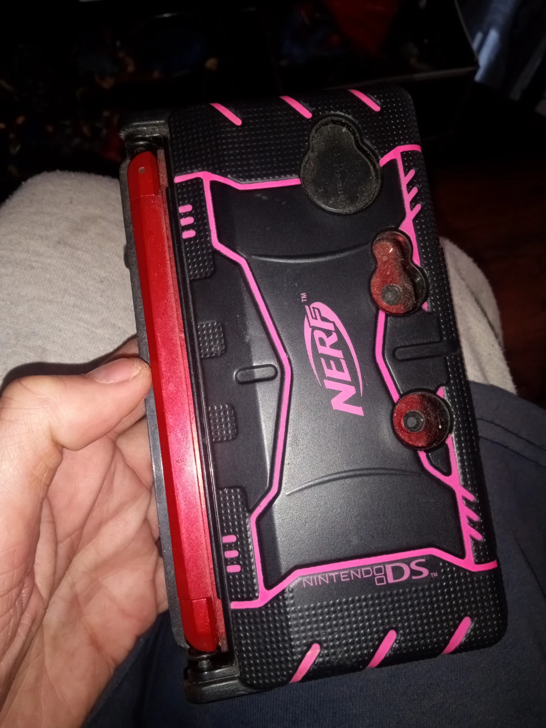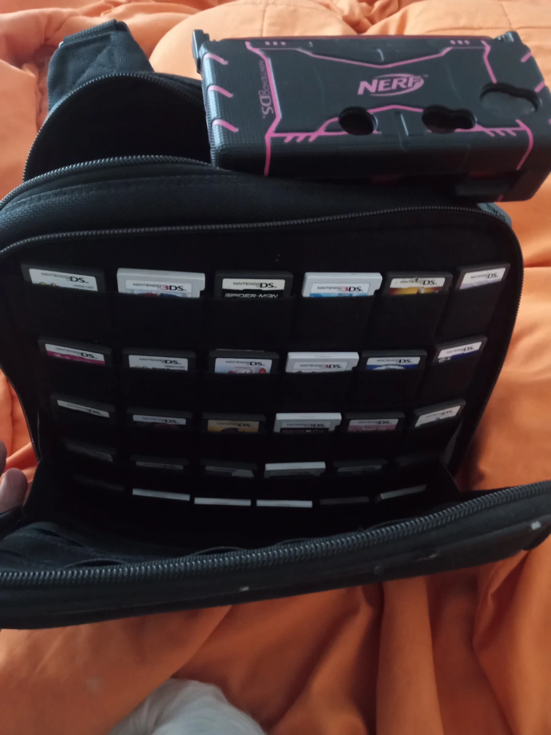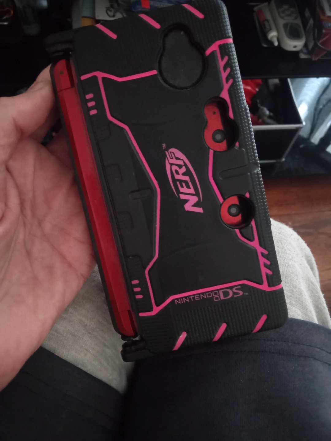 Awesome Nerf armor case is designed for the Nintendo DS/ 3DS and includes a large game storage bag. The case offers protection and a tactical look with its black and pink design. The storage bag holds numerous Nintendo DS/3DS game cartridges.Region-free and fully customizible system,