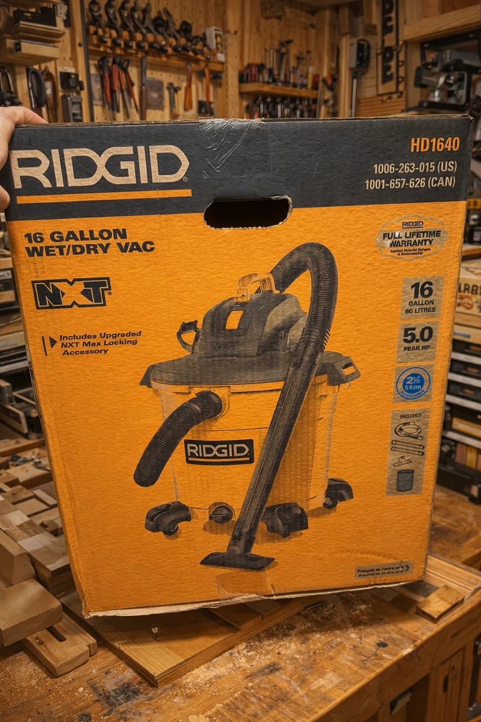 This Ridgid 16-gallon wet/dry vac has a 5.0 peak HP motor. It includes an upgraded NXT Max Locking accessory. The vac comes with a hose, wands, and a filter. It's great for tackling tough messes in your garage or workshop!