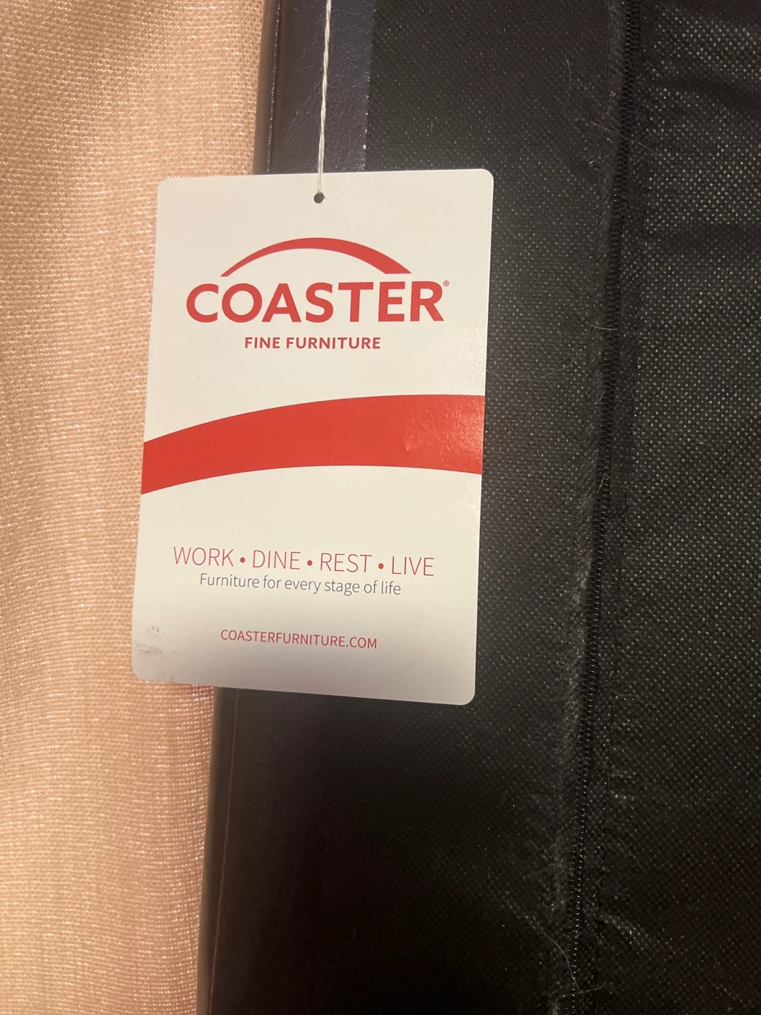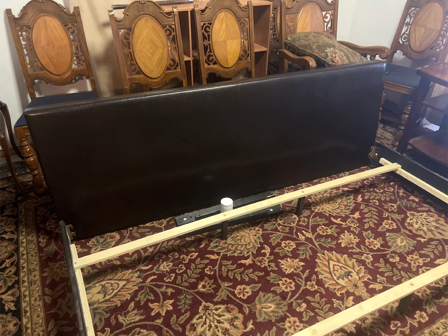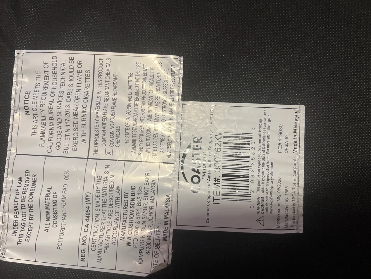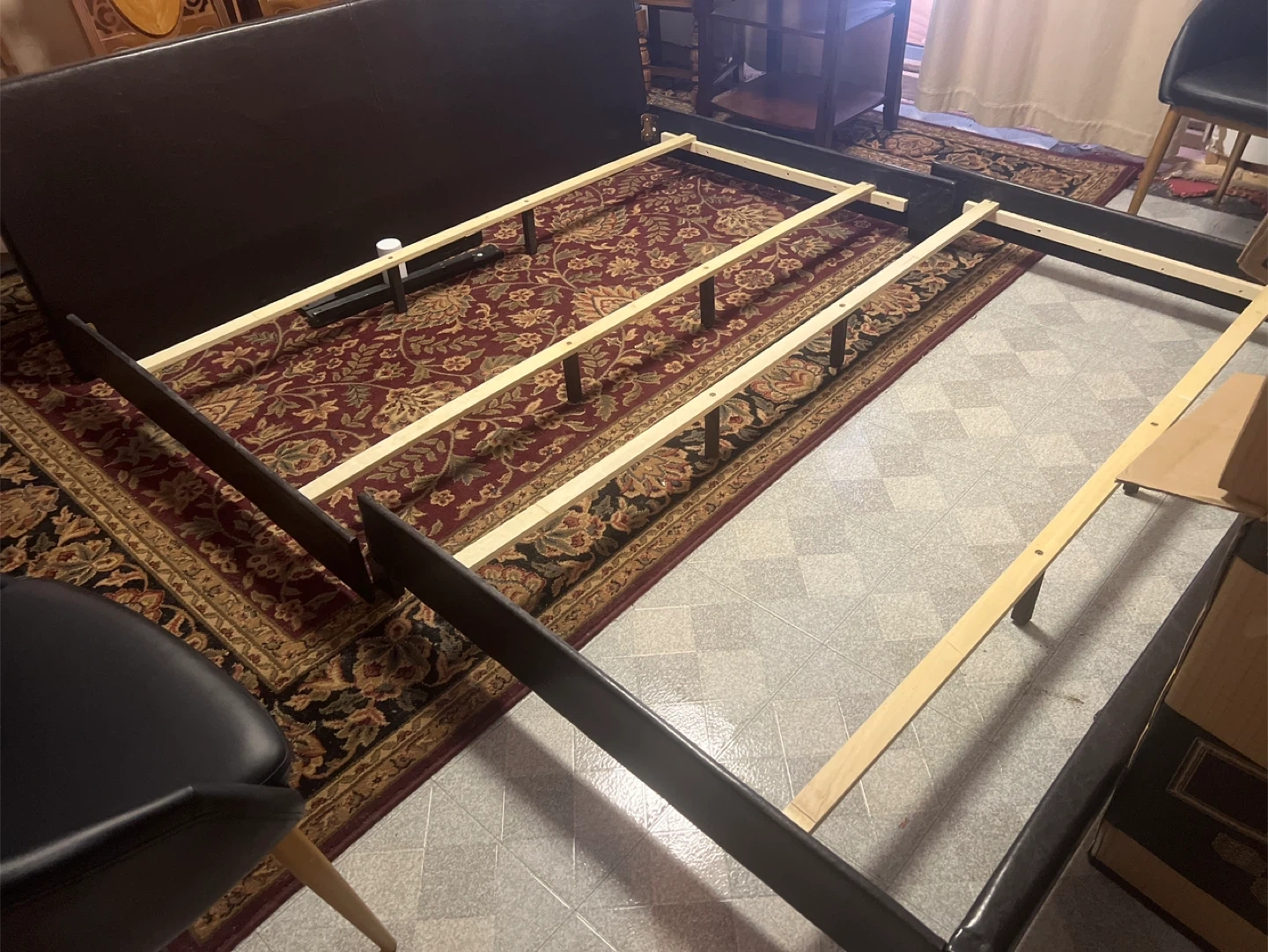 This is a California King Size dark brown upholstered headboard and bed frame from Coaster Fine Furniture. The frame includes wooden slats for mattress support. It's made with polyurethane foam padding. All hardware is here.