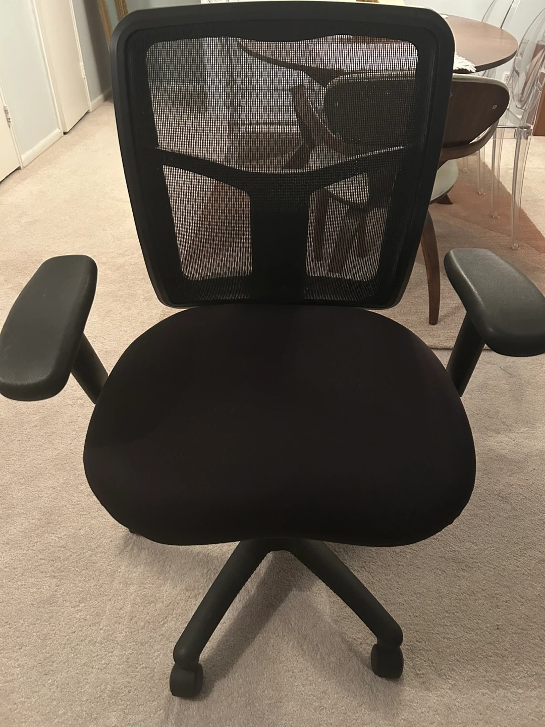 Used black office chair in great condition. It features a mesh back and padded seat for comfort during long work sessions. Adjustable height with wheels for easy transport. Comes with extra wheels & back padded support not shown . Smoke free pet free home.