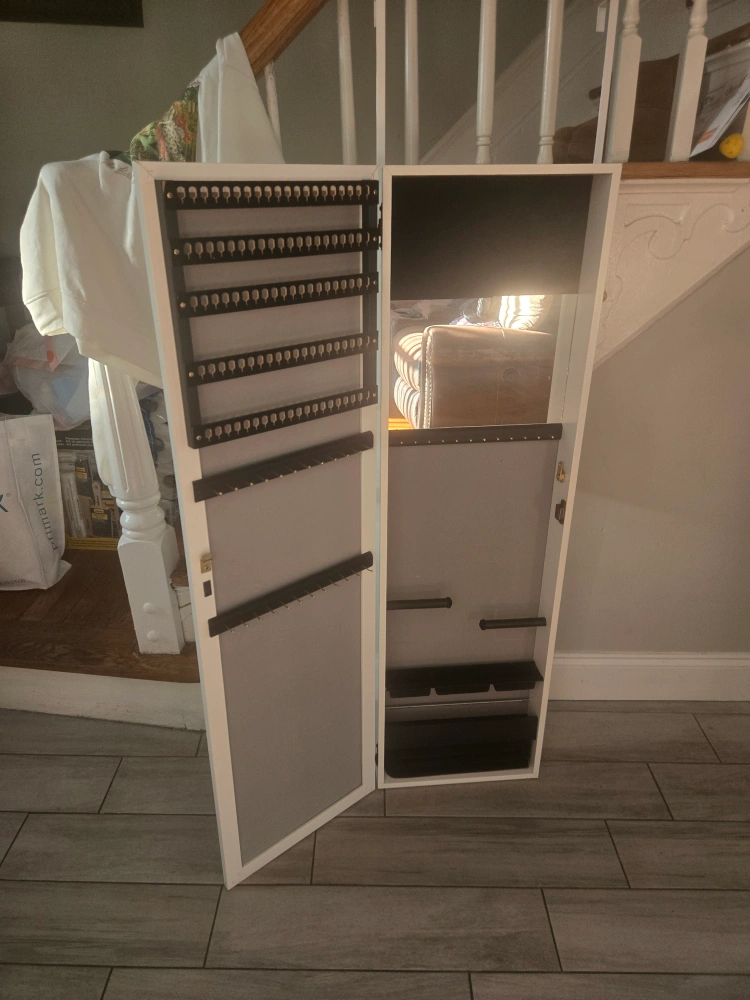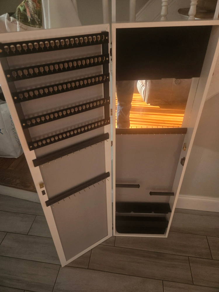 White jewelry armoire with full-length mirror. Features many hooks and slots for necklaces, earrings, and bracelets. Perfect for organizing jewelry and adding style to any room. hangs over door or wall