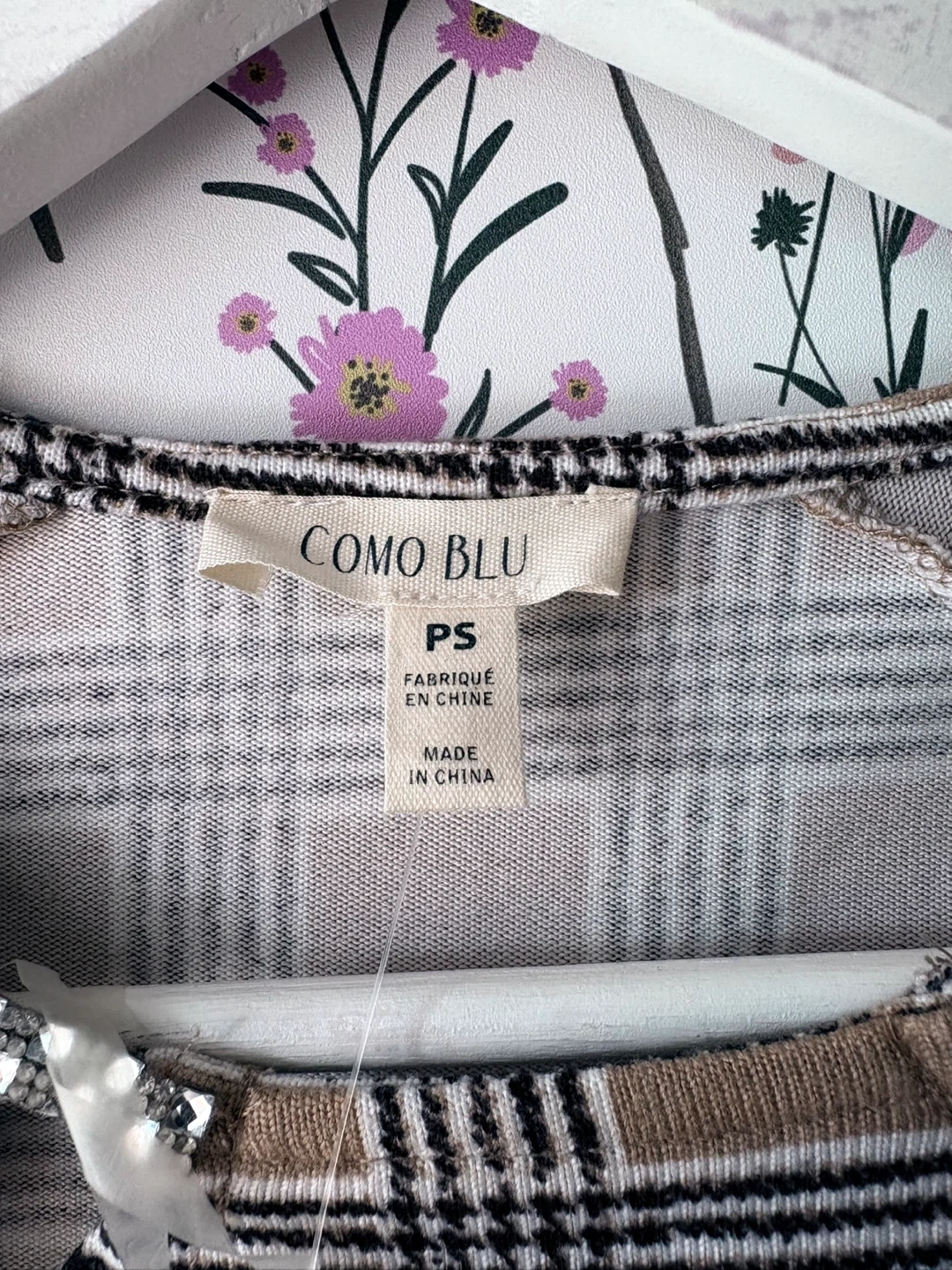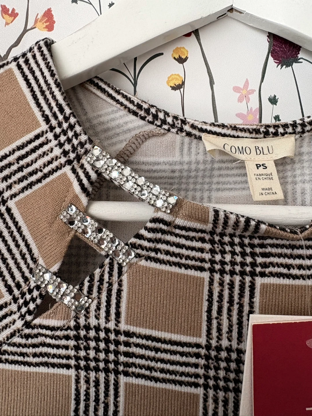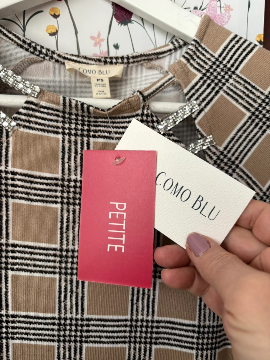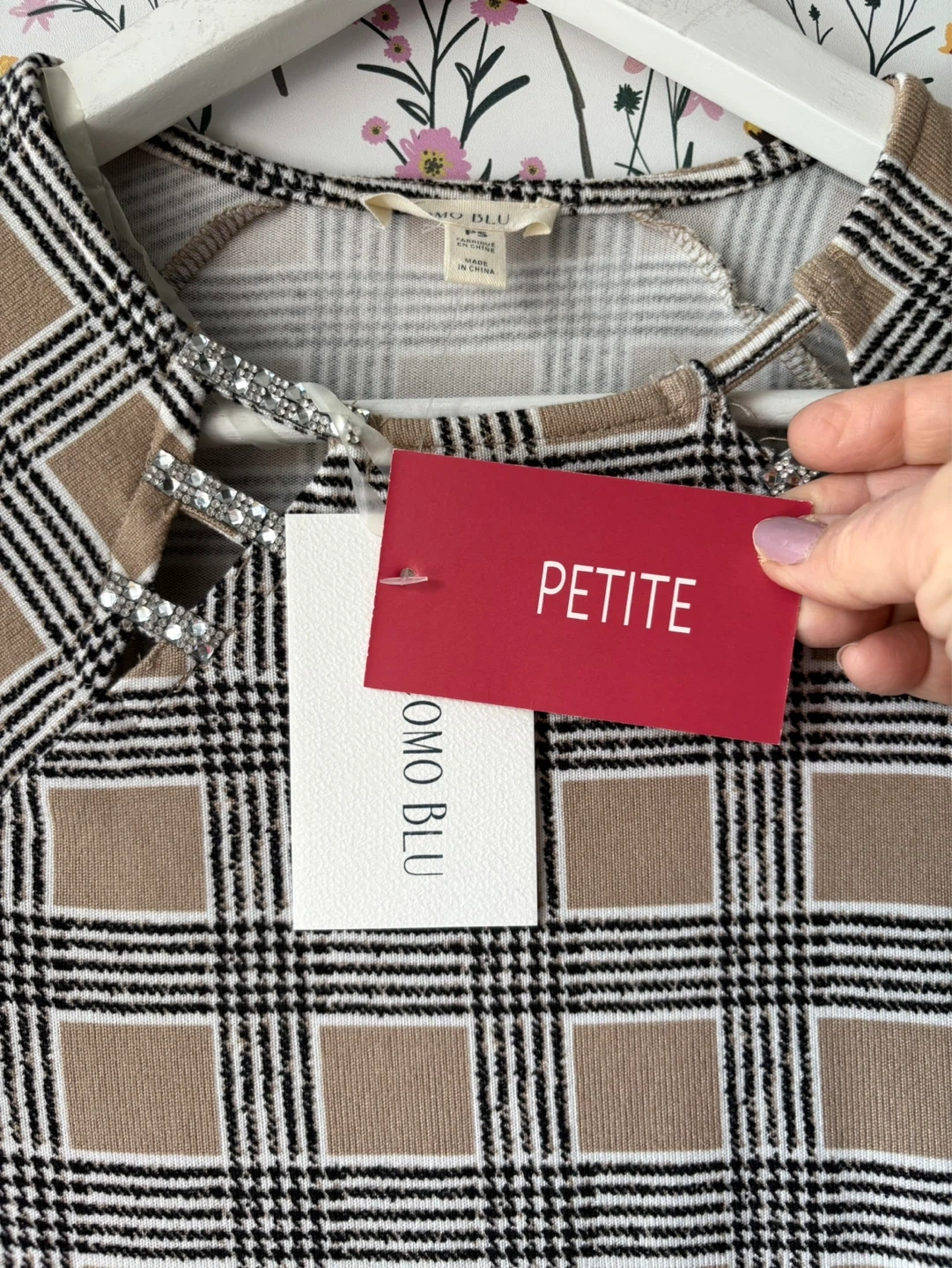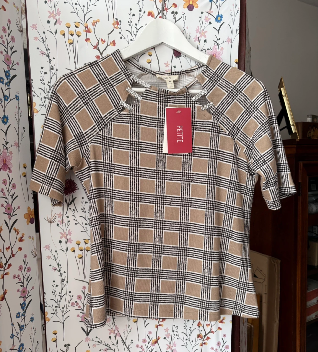 Chic petite top with a stylish plaid pattern. It's made from a comfortable 95% polyester and 5% spandex blend. Features a unique neckline detail with subtle embellishments. Perfect for adding a touch of sophistication to your casual outfits!