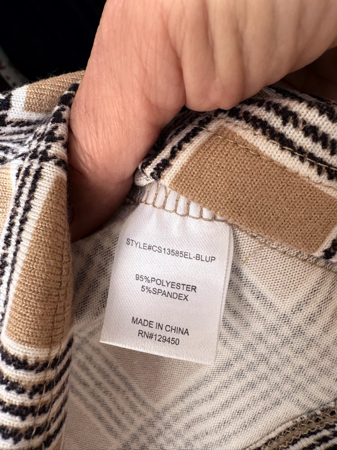 Chic petite top with a stylish plaid pattern. It's made from a comfortable 95% polyester and 5% spandex blend. Features a unique neckline detail with subtle embellishments. Perfect for adding a touch of sophistication to your casual outfits!
