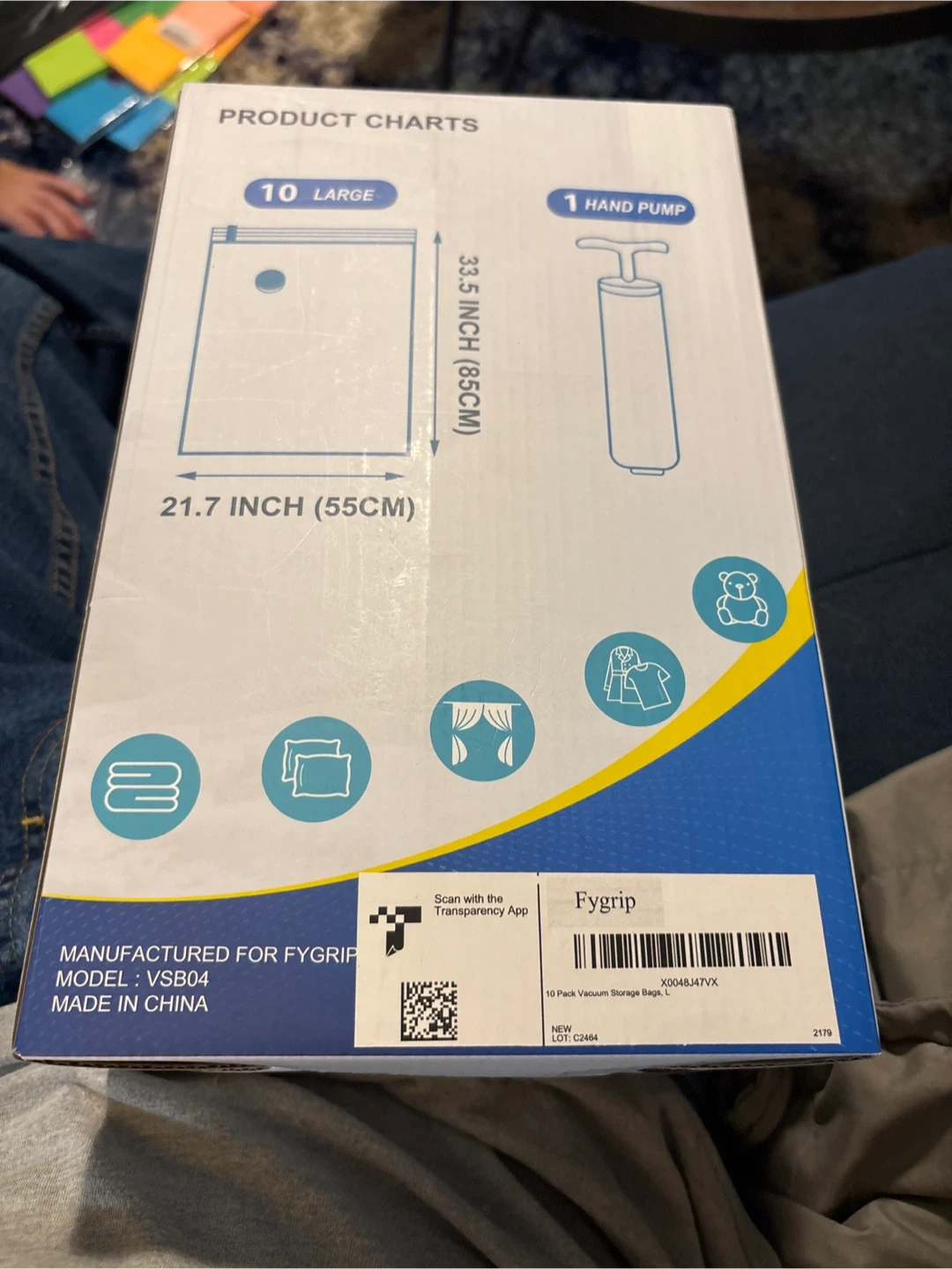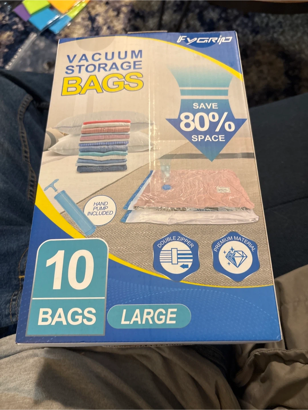 67I'm selling a pack of Fygrip vacuum storage bags! It includes 10 large bags, perfect for saving space. The box also includes a hand pump to help you get started. These bags are great for storing clothes, bedding, and more, saving up to 80% space