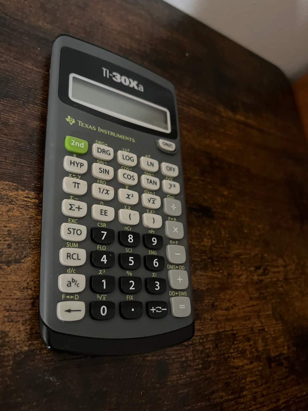 Used TI-30Xa scientific calculator. Gray plastic casing. Standard scientific functions. Good condition.