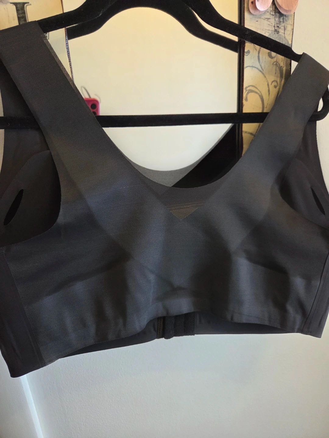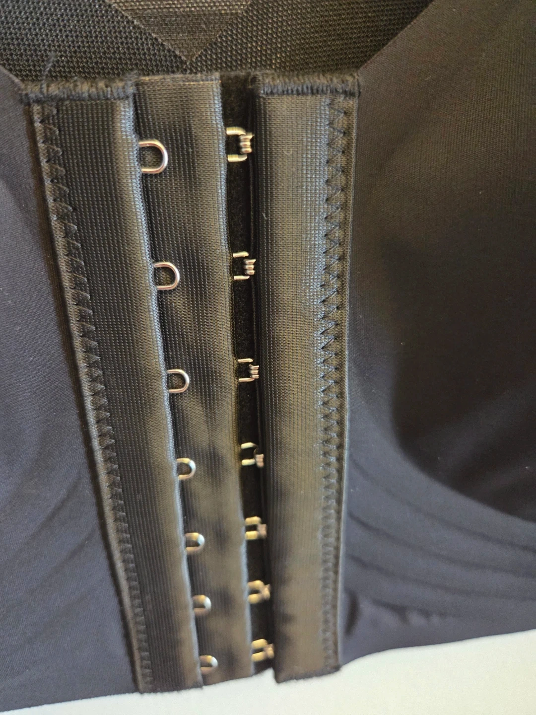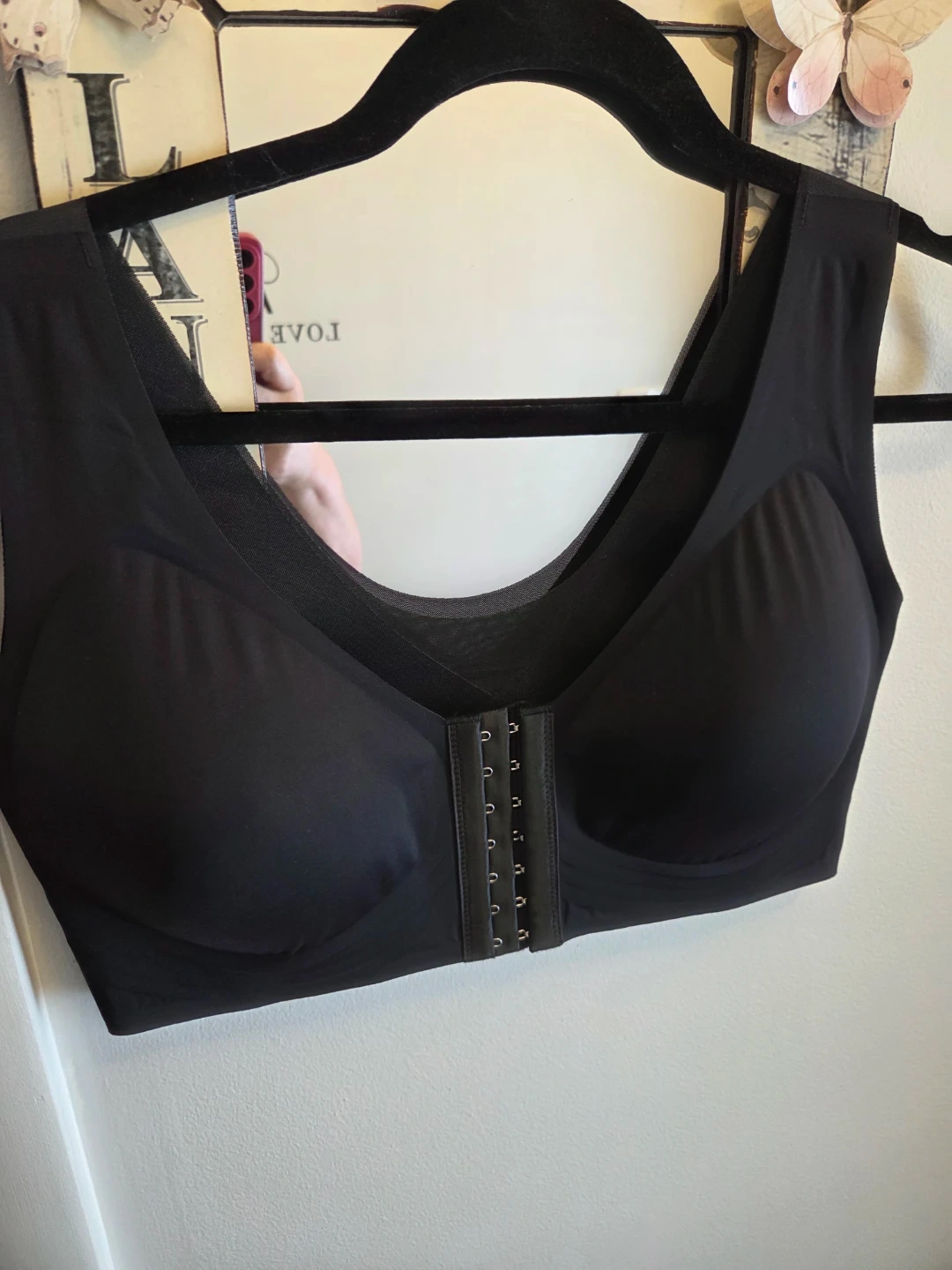 This black comfort bra is made of 76% Nylon and 26% Elastane. It features a front hook and eye closure for easy on and off. Hand wash cold, do not bleach. Line dry in shade. Cool iron, do not dry clean, do not soak.
