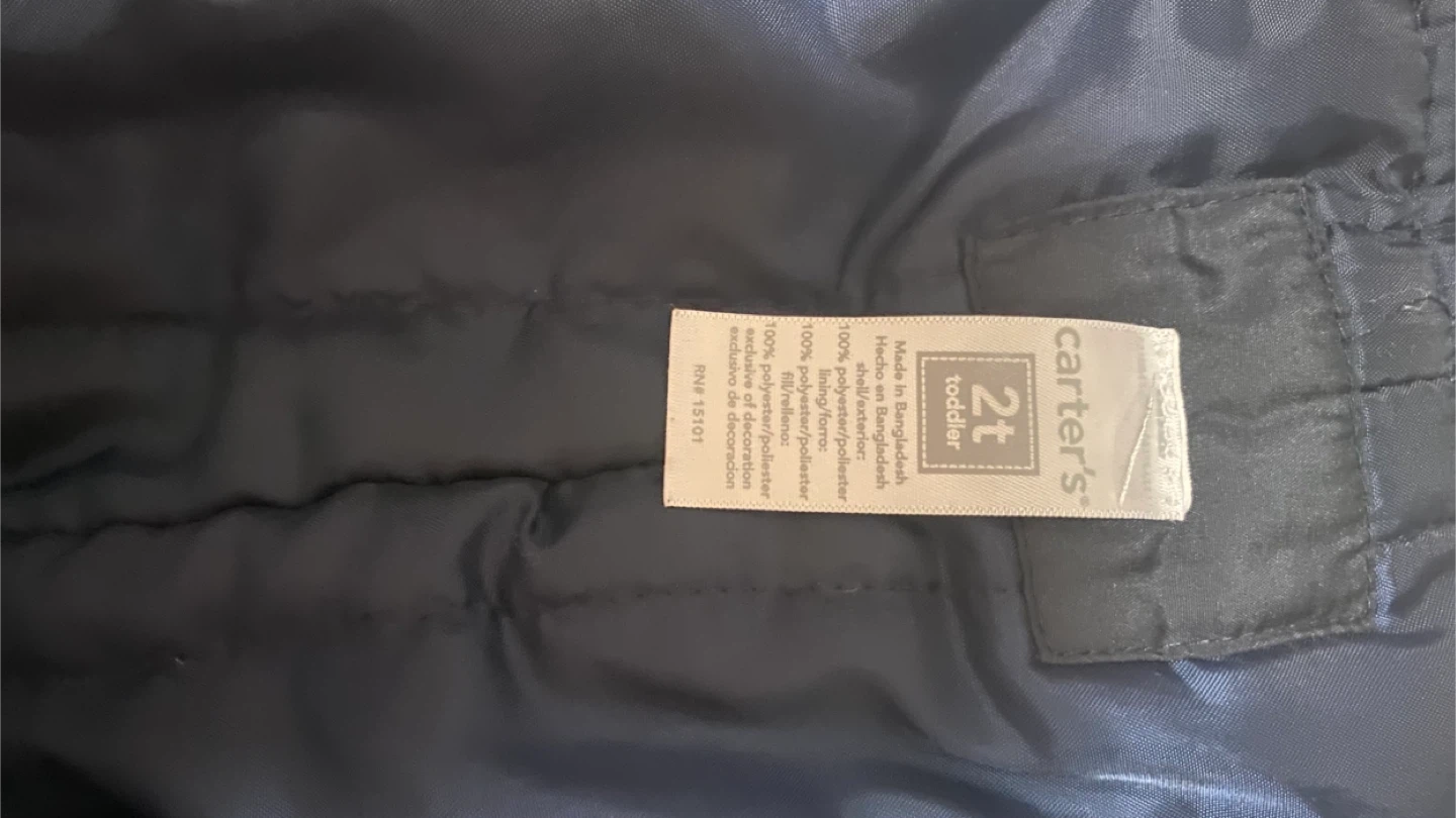 Here's a Carter's snow bib for your toddler! It's a size 2T and in a classic navy color. Perfect for keeping your little one warm and dry during winter adventures
