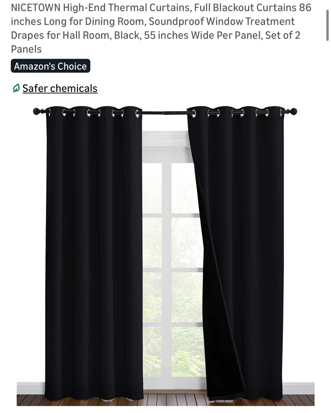 NICETOWN High-End Thermal Curtains. Blackout and soundproof treatment drapes. Each panel is 86 inches long and 55 inches wide. Set includes 2 panels.