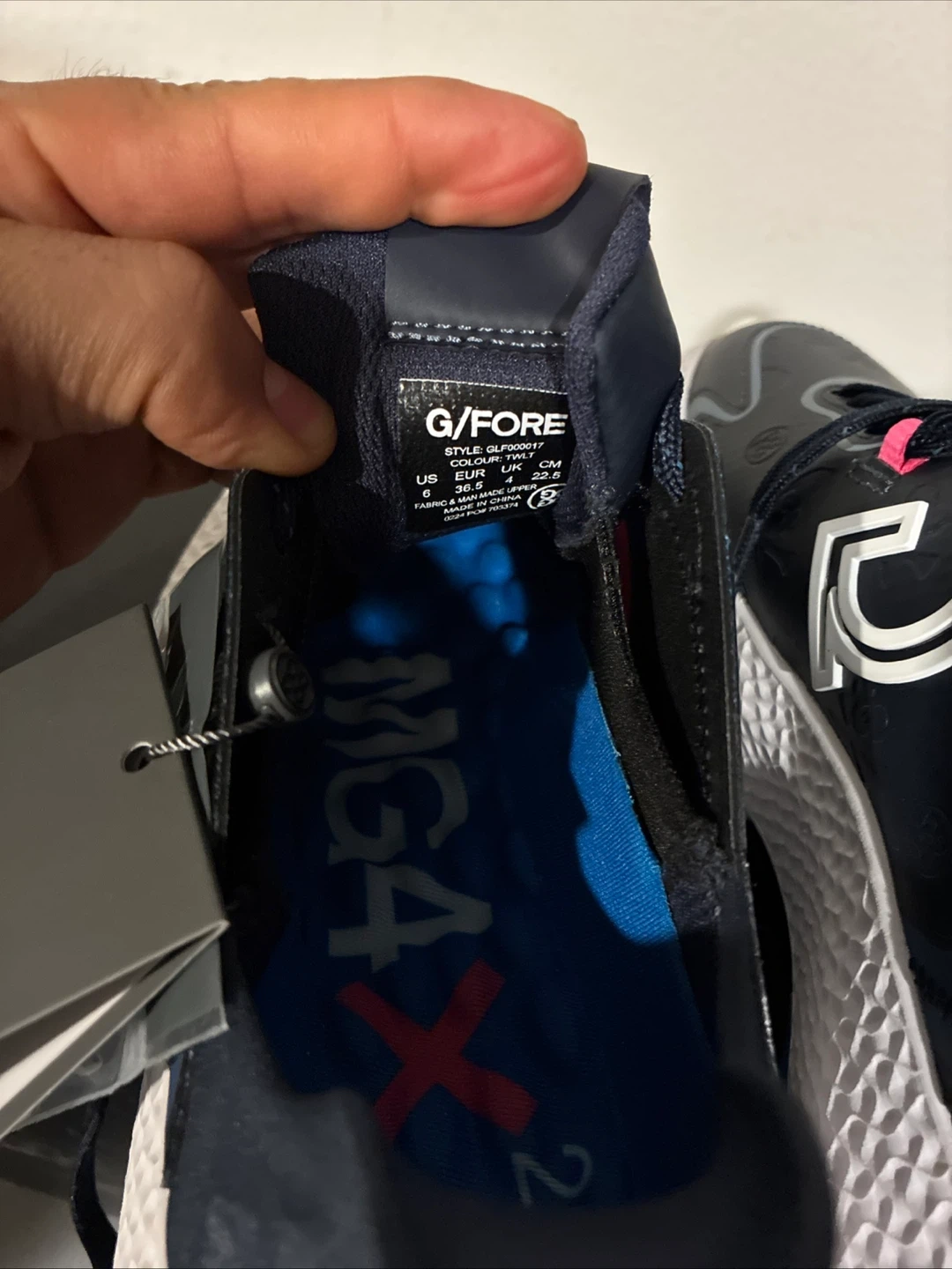 Selling a pair of G/FORE MG4X2 golf shoes in US women's size 6! These stylish and comfortable shoes are perfect for the golf course. They feature a unique design and are made with high-quality materials for durability and performance. Comes with original box and extra laces!