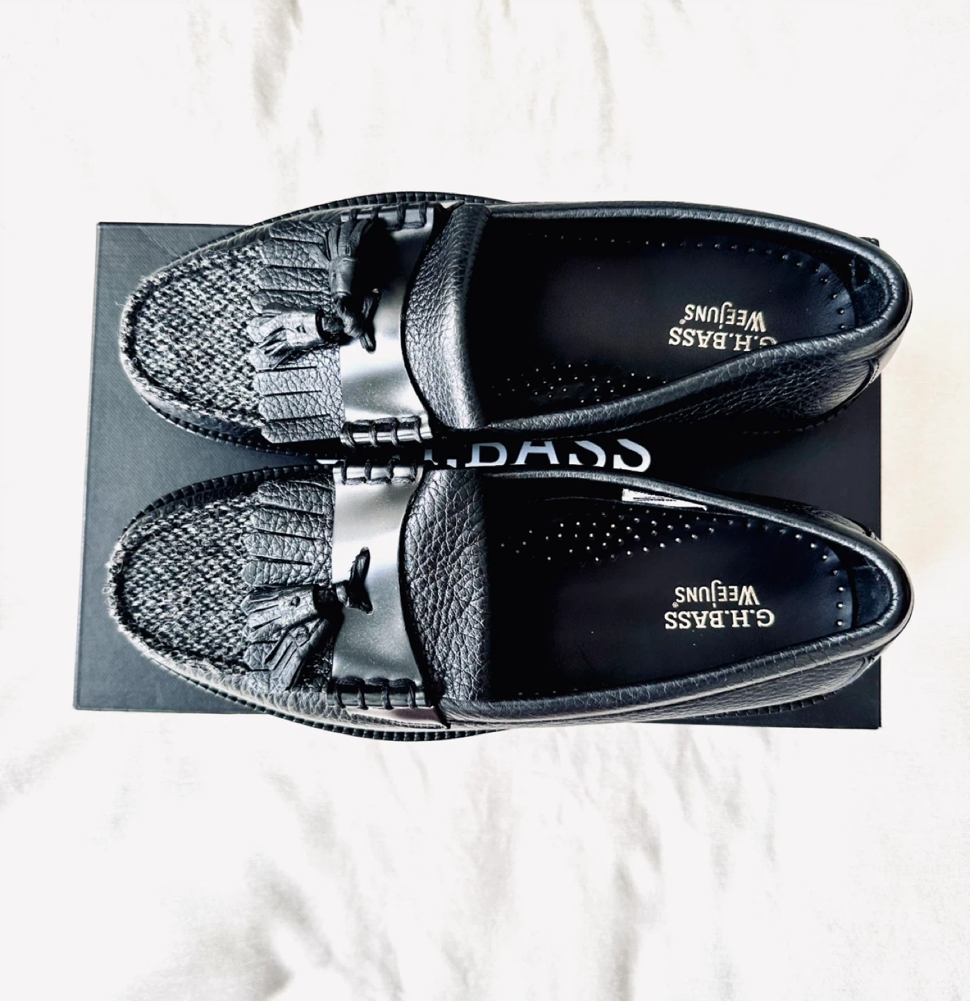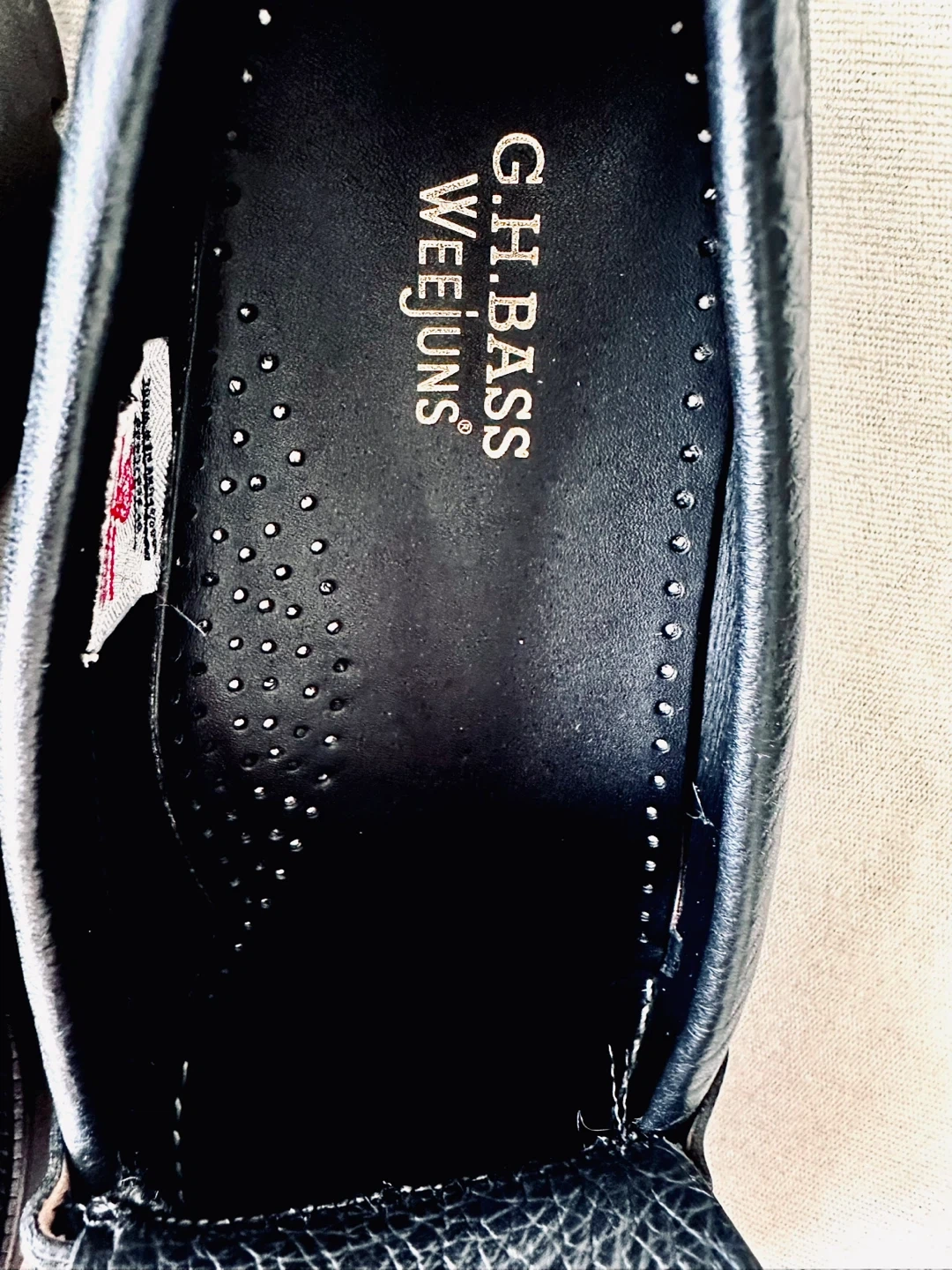 65Selling a pair of G.H. Bass Weejuns loafers in black! These are stylish and comfortable, perfect for any occasion. They have a classic design with tassel detailing and a complimentary fabric toe. Check out the photos for a closer look! Run large, the fit is closer to 8.
