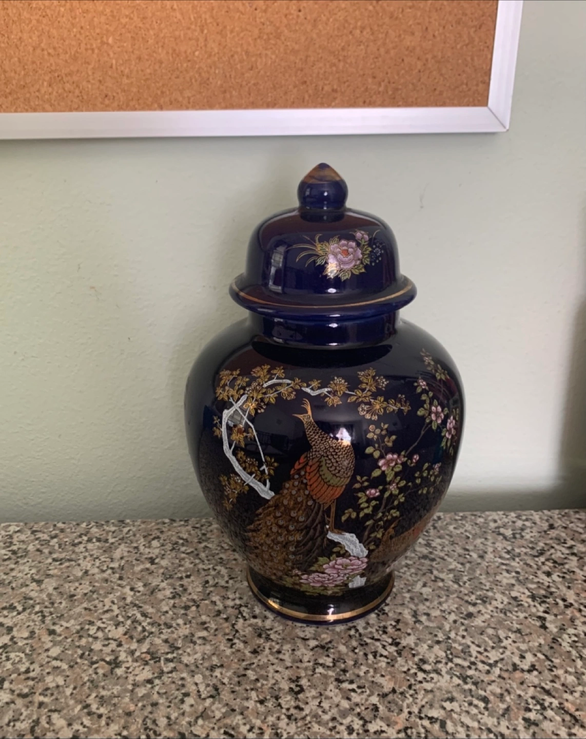 Selling a beautiful blue decorative jar with a lid! It features a lovely peacock and floral design. Perfect for adding a touch of elegance to any room