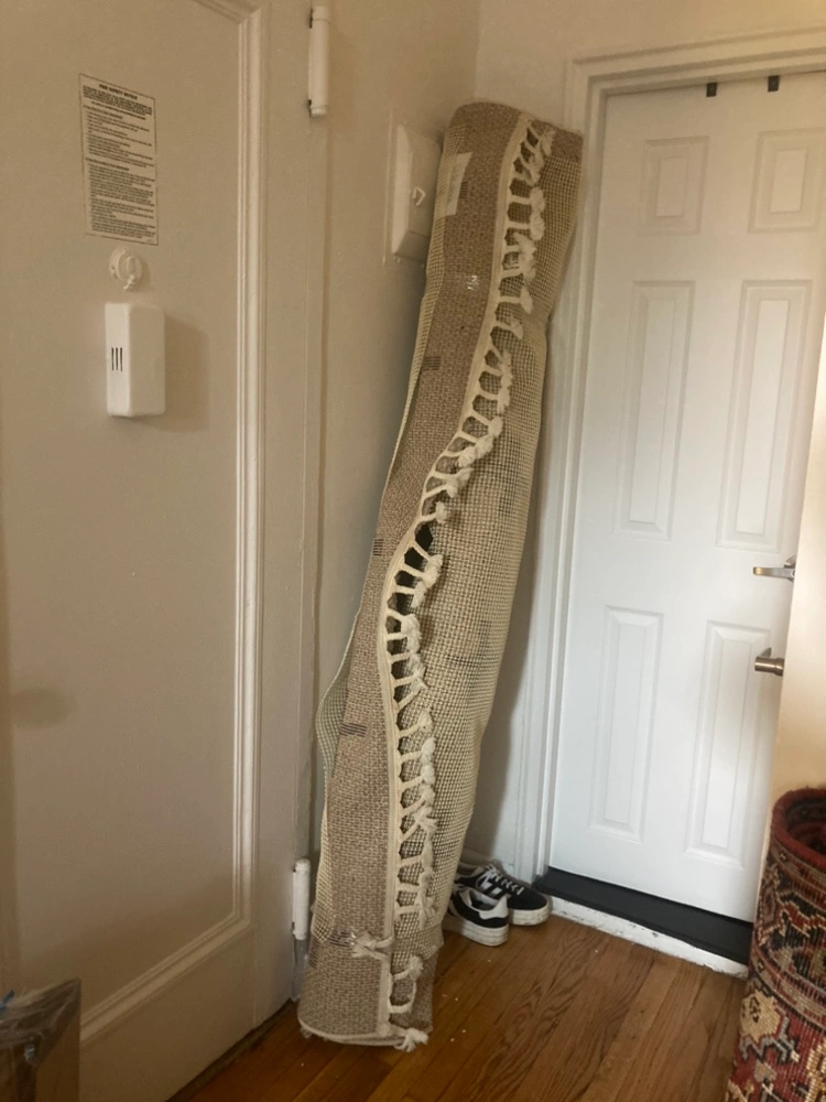 NOW SITTING BETWEEN 1ST AND 2ND AVE ON 85TH ST. FREE FIRST COME FIRST SERVED. This rug has a black and white cross pattern on an off white background. Shag style, 100% polypropylene. Great condition but needs cleaning. Wrapped up for transport and comes with rug pad. Moved and no longer fits my space. Pickup only, can accept cash/paypal.