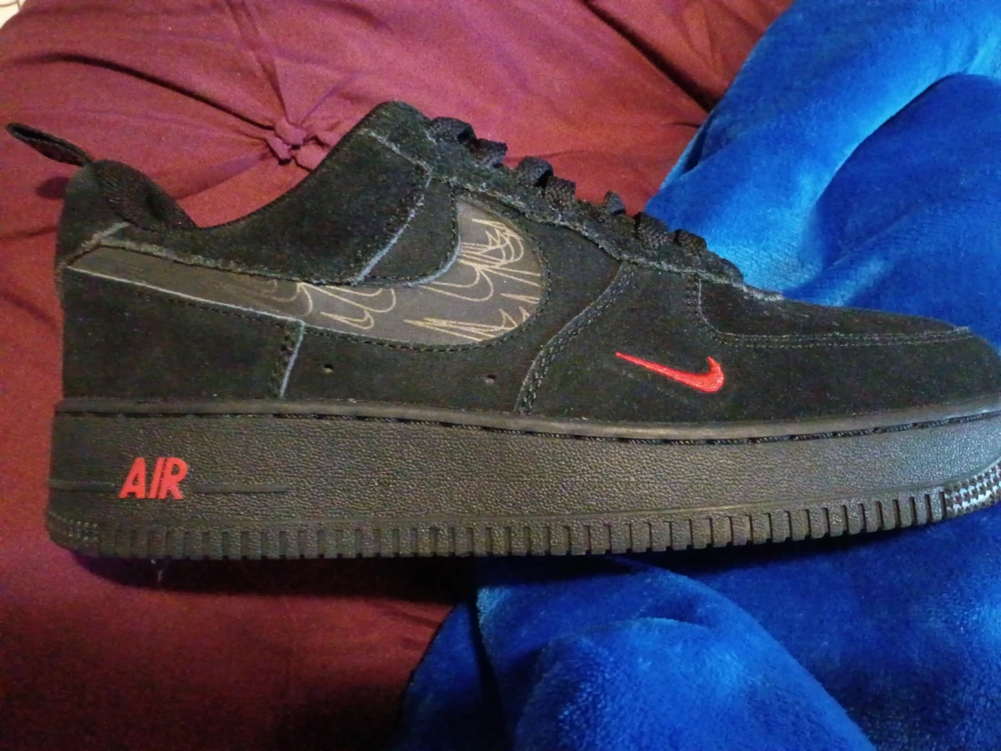 Selling a pair of Nike Air Force 1 sneakers in black! They're in great shape and ready for a new owner. The iconic design and comfortable fit make them a classic choice for everyday wear. The red accents add a pop of color to the sleek black design, making them stand out!