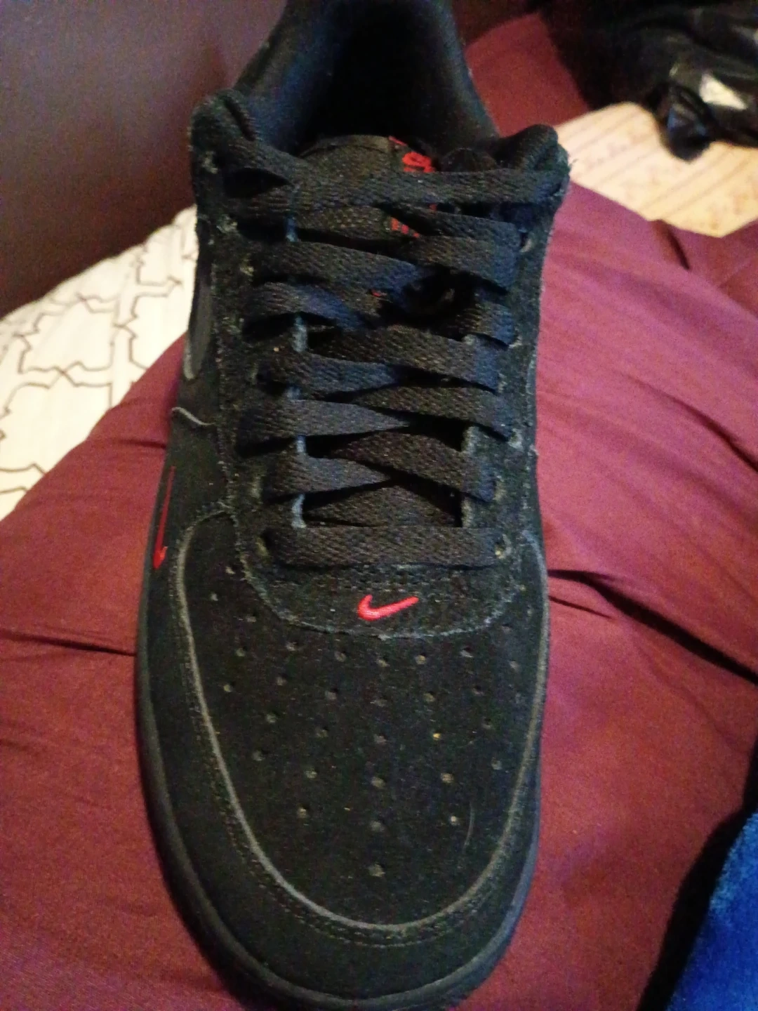 Selling a pair of Nike Air Force 1 sneakers in black! They're in great shape and ready for a new owner. The iconic design and comfortable fit make them a classic choice for everyday wear. The red accents add a pop of color to the sleek black design, making them stand out!