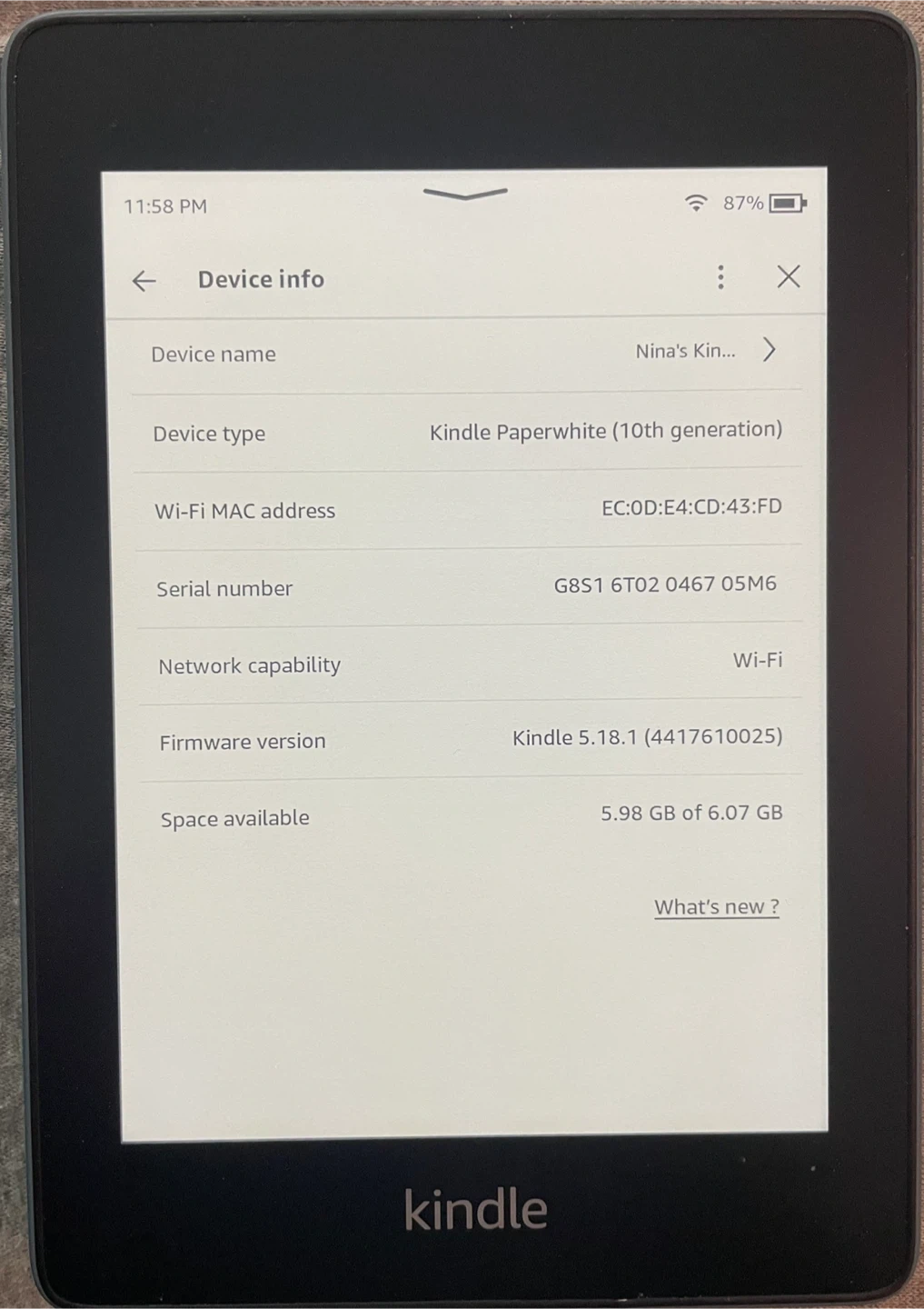 This is a Kindle Paperwhite, 10th generation e-reader. It's Wi-Fi enabled and comes with 6.07 GB of space available. The firmware version is Kindle 5.18.1. This e-reader is great for reading books on the go!